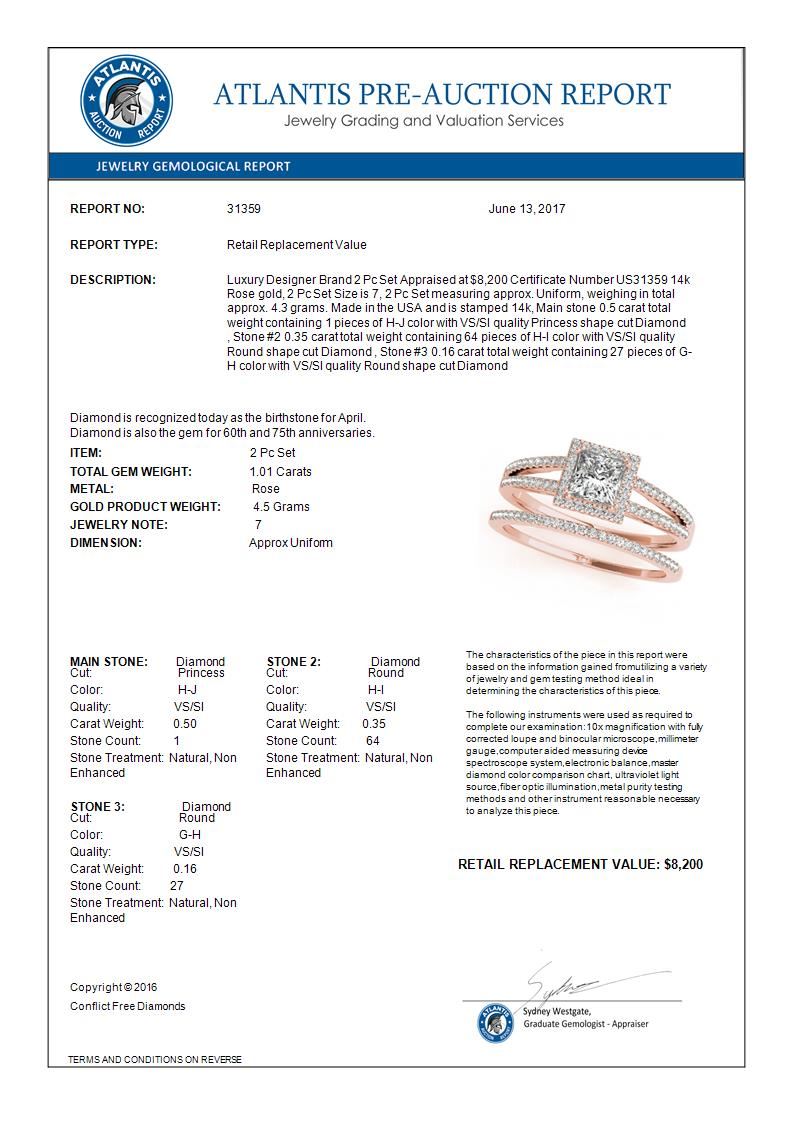 1.01 CTW Certified VS/SI Princess Diamond 2Pc Set Solitaire Halo 14K Rose Gold ---- Luxury Designer Brand 2 Pc Set Appraised Retail Price at $8,200 ---- SKU Number US31359 14k Rose gold 2 Pc Set Size is 7, 2 Pc Set measuring approx. Uniform, weighing in total approx. 4.3 grams. Made in the USA and is stamped 14k, Main stone 0.50 carat total weight containing 1 pieces of H-J color with VS/SI quality Princess shape cut Diamond , Stone #2 0.35 carat total weight containing 64 pieces of H-I color with VS/SI quality Round shape cut