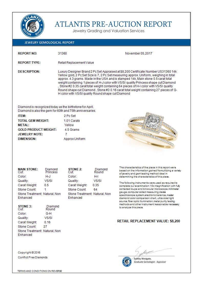REF-148W9F -31360 ---- 1.01 CTW Certified VS/SI Princess Diamond 2Pc Set Solitaire Halo 14K Yellow Gold ---- Luxury Designer Brand 2 Pc Set Appraised at $8,200 Certificate Number US31360 14k Yellow gold, 2 Pc Set Size is 7, 2 Pc Set measuring approx. Uniform, weighing in total approx. 4.3 grams. Made in the USA and is stamped 14k, Main stone 0.5 carat total weight containing 1 pieces of H-J color with VS/SI quality Princess shape cut Diamond , Stone #2 0.35 carat total weight containing 64 pieces of H-I color with VS/SI quality Round shape cut Diamond , Stone #3 0.16 carat total weight containing 27 pieces of G-H color with VS/SI quality Round shape cut Diamond