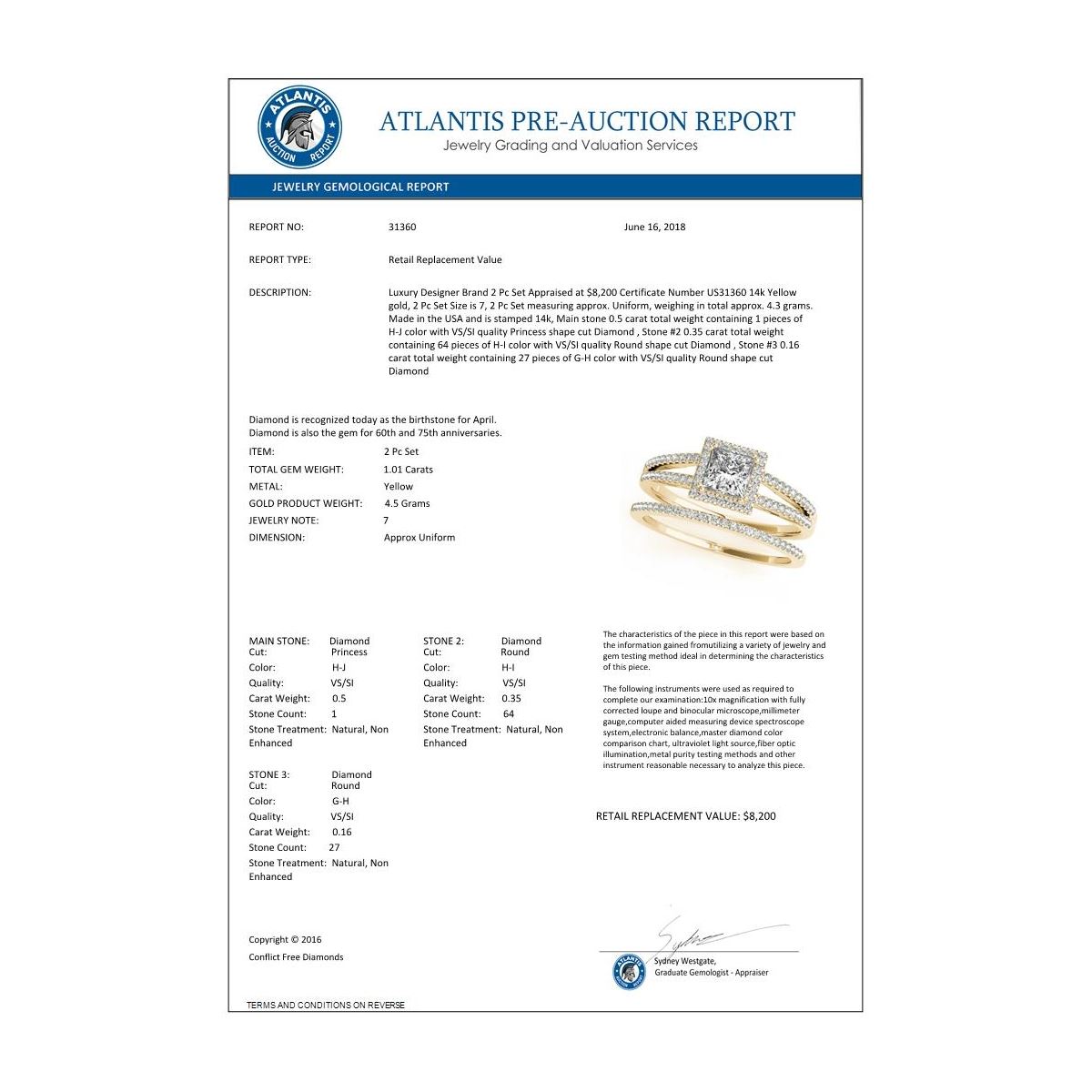 REF-148W9F -31360 ---- 1.01 CTW Certified VS/SI Princess Diamond 2Pc Set Solitaire Halo 14K Yellow Gold ---- Luxury Designer Brand 2 Pc Set Appraised at $8,200 Certificate Number US31360 14k Yellow gold, 2 Pc Set Size is 7, 2 Pc Set measuring approx. Uniform, weighing in total approx. 4.3 grams. Made in the USA and is stamped 14k, Main stone 0.5 carat total weight containing 1 pieces of H-J color with VS/SI quality Princess shape cut Diamond , Stone #2 0.35 carat total weight containing 64 pieces of H-I color with VS/SI quality Round shape cut Diamond , Stone #3 0.16 carat total weight containing 27 pieces of G-H color with VS/SI quality Round shape cut Diamond