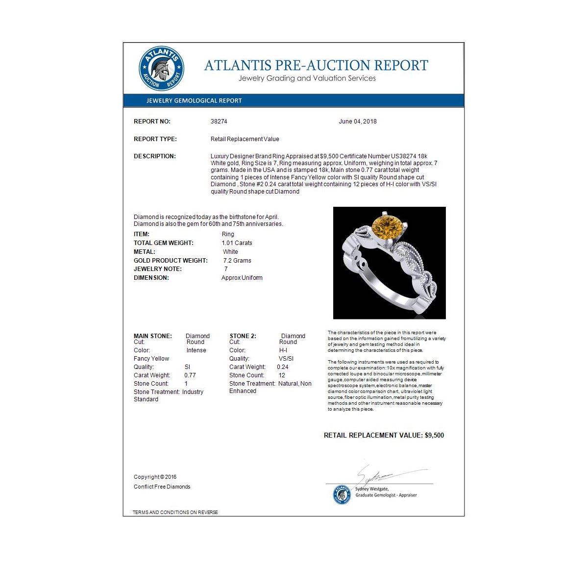 REF-143A6X -38274 ---- 1.01 CTW Intense Fancy Yellow Diamond Engagement Art Deco Ring 18K White Gold ---- Luxury Designer Brand Ring Appraised at $9,500 Certificate Number US38274 18k White gold, Ring Size is 7, Ring measuring approx. Uniform, weighing in total approx. 7 grams. Made in the USA and is stamped 18k, Main stone 0.77 carat total weight containing 1 pieces of Intense Fancy Yellow color with SI quality Round shape cut Diamond , Stone #2 0.24 carat total weight containing 12 pieces of H-I color with VS/SI quality Round shape cut Diamond