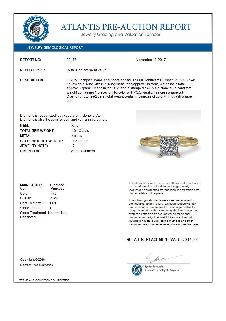 REF-297K2W -32167 ---- 1.01 CTW Princess Cut VS/SI Diamond Engagement Designer Ring 14K Yellow Gold ---- Luxury Designer Brand Ring Appraised at $17,800 Certificate Number US32167 14k Yellow gold, Ring Size is 7, Ring measuring approx. Uniform, weighing in total approx. 3 grams. Made in the USA and is stamped 14k, Main stone 1.01 carat total weight containing 1 pieces of H-J color with VS/SI quality Princess shape cut Diamond , Stone #2 carat total weight containing pieces of color with quality shape cut