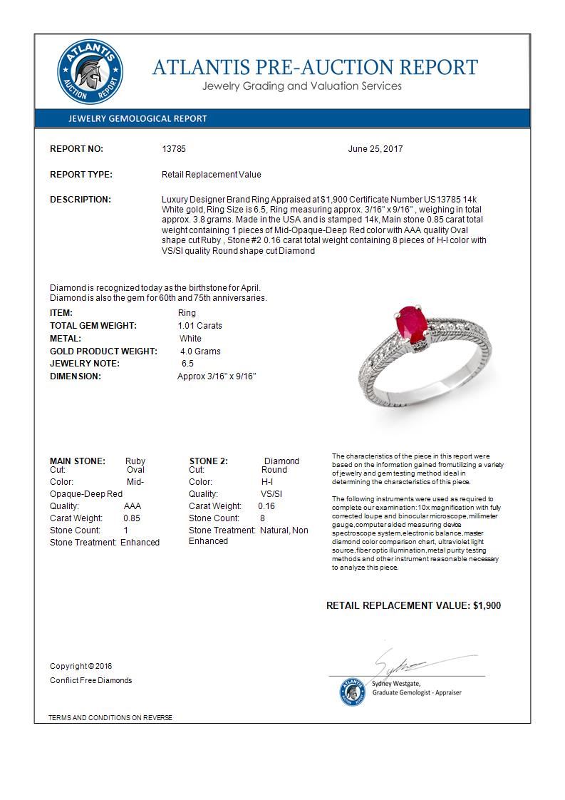 1.01 CTW Ruby & Diamond Ring 14K White Gold ---- Luxury Designer Brand Ring Appraised Retail Price at $1,900 ---- SKU Number US13785 14k White gold Ring Size is 6.5, Ring measuring approx. 3/16" x 9/16" , weighing in total approx. 3.8 grams. Made in the USA and is stamped 14k, Main stone 0.85 carat total weight containing 1 pieces of Mid-Opaque-Deep Red color with AAA quality Oval shape cut Ruby , Stone #2 0.16 carat total weight containing 8 pieces of H-I color with VS/SI quality Round shape cut
