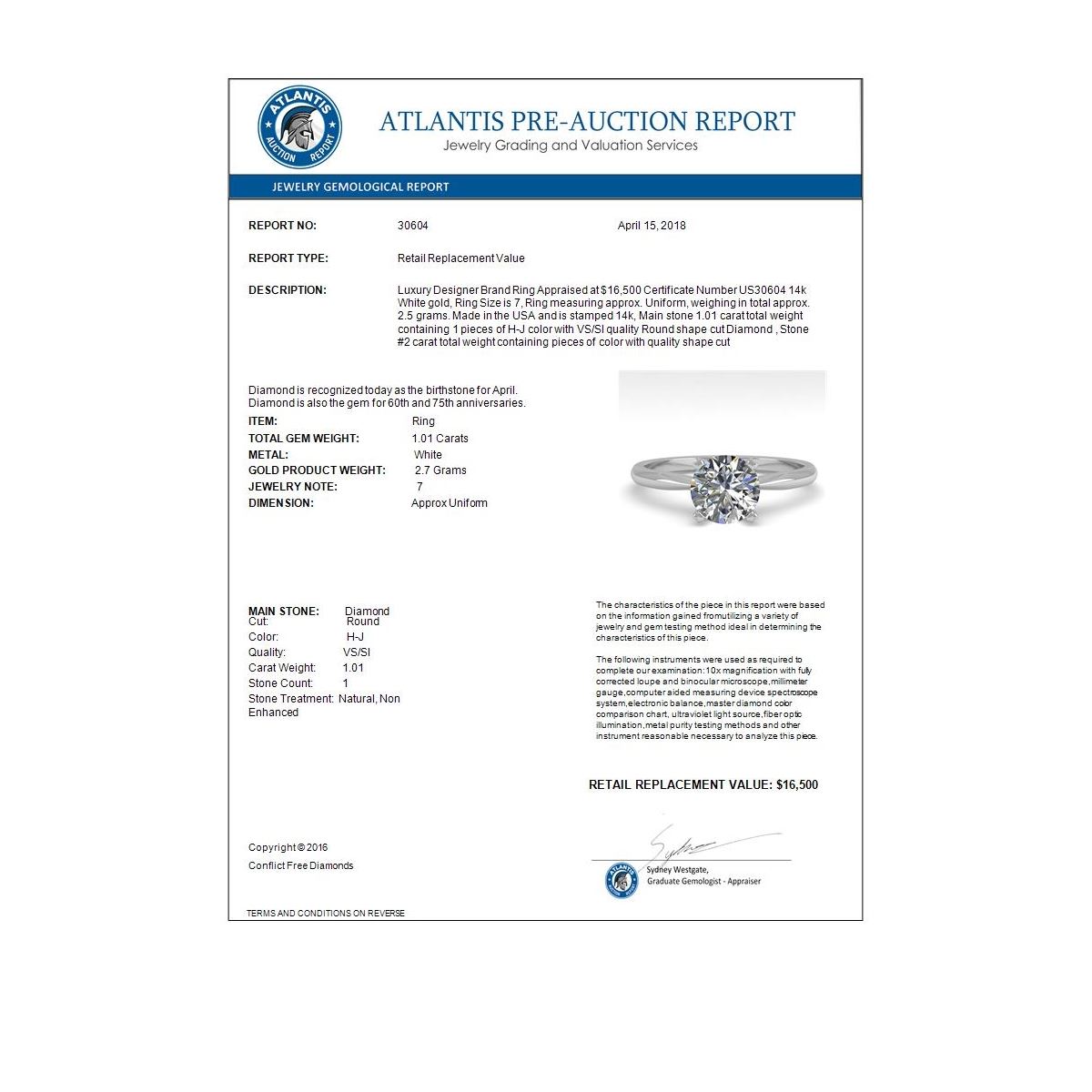 REF-274W8F -30604 ---- 1.01 CTW VS/SI Diamond Engagement Designer Ring 14K White Gold ---- Luxury Designer Brand Ring Appraised at $16,500 Certificate Number US30604 14k White gold, Ring Size is 7, Ring measuring approx. Uniform, weighing in total approx. 2.5 grams. Made in the USA and is stamped 14k, Main stone 1.01 carat total weight containing 1 pieces of H-J color with VS/SI quality Round shape cut Diamond , Stone #2 carat total weight containing pieces of color with quality shape cut
