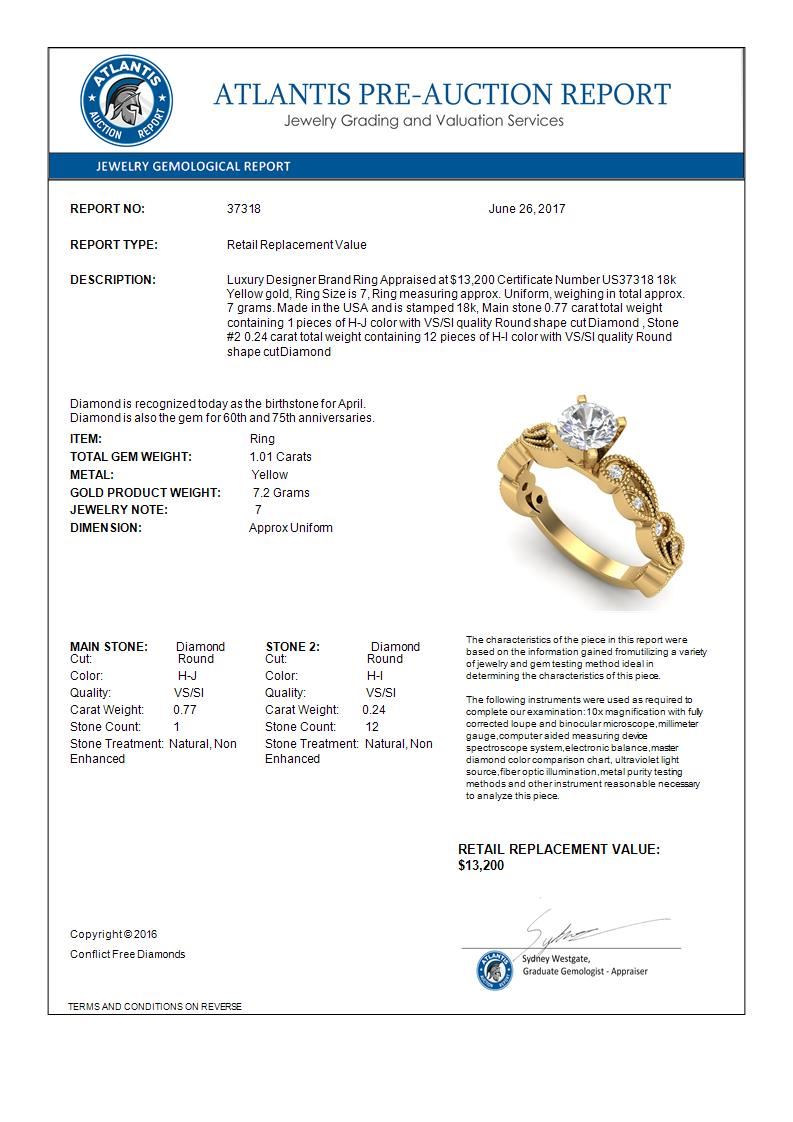 1.01 CTW VS/SI Diamond Solitaire Art Deco Ring 18K Yellow Gold ---- Luxury Designer Brand Ring Appraised Retail Price at $13,200 ---- SKU Number US37318 18k Yellow gold Ring Size is 7, Ring measuring approx. Uniform, weighing in total approx. 7 grams. Made in the USA and is stamped 18k, Main stone 0.77 carat total weight containing 1 pieces of H-J color with VS/SI quality Round shape cut Diamond , Stone #2 0.24 carat total weight containing 12 pieces of H-I color with VS/SI quality Round shape cut