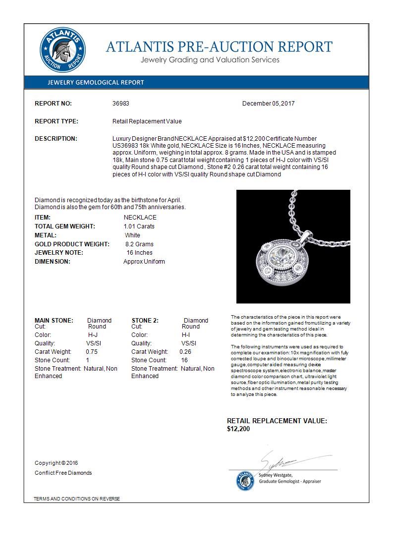 REF-221A8X -36983 ---- 1.01 CTW VS/SI Diamond Solitaire Art Deco Stud Necklace 18K White Gold ---- Luxury Designer Brand NECKLACE Appraised at $12,200 Certificate Number US36983 18k White gold, NECKLACE Size is 16 Inches, NECKLACE measuring approx. Uniform, weighing in total approx. 8 grams. Made in the USA and is stamped 18k, Main stone 0.75 carat total weight containing 1 pieces of H-J color with VS/SI quality Round shape cut Diamond , Stone #2 0.26 carat total weight containing 16 pieces of H-I color with VS/SI quality Round shape cut Diamond