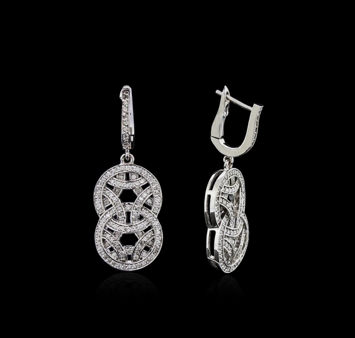 One pair stamped & tested 14KT white gold lady's combination cast & assembled dangle earrings with hinged clip backs with a bright polish finish. Condition is new. Identified with markings of "14K". Containing: Two hundred eighteen bead set round brilliant cut diamonds, measuring 1.10 - 1.00 x 0.65mm (depth est.) approximate total weight of 218 Stones = 1.01ct. Clarity: SI-2 to I-1. Color: H - I. Cut: Good. Total Weight of Diamonds: 1.01ct. Total Weight of Earrings: 9.00 gm. GAS Appraised at $4,225.00.