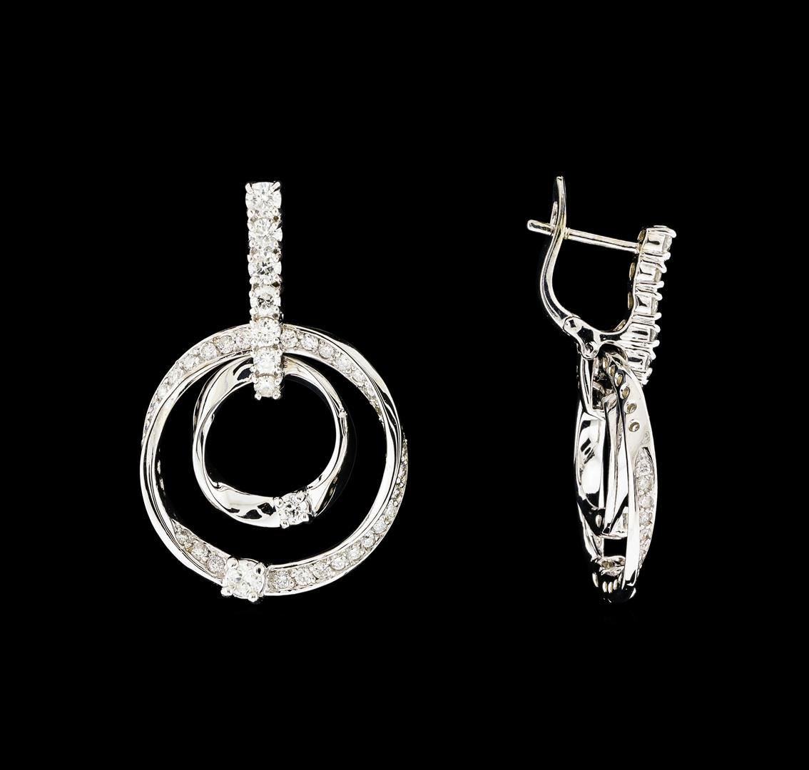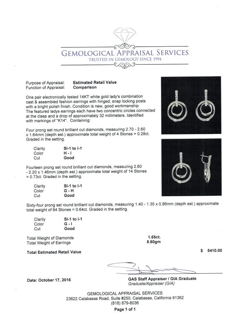 One pair electronically tested 14KT white gold lady's combination cast & assembled fashion earrings with hinged, snap locking posts with a bright polish finish. The featured ladys earrings each have two concentric circles connected at the clasp and a drop of approximately 32 millimeters. Identified with markings of 'K14'. Condition is new, good workmanship. Containing: Four prong set round brilliant cut diamonds, measuring 2.70 - 2.60 x 1.64mm (depth est.) approximate total weight of 4 Stones = 0.28ct. Graded in the setting. Clarity SI-1 to I-1. Color: H - I Cut Good Fourteen prong set round brilliant cut diamonds, measuring 2.60 - 2.20 x 1.46mm (depth est.) approximate total weight of 14 Stones = 0.73ct. Graded in the setting. Clarity SI-1 to I-1. Color: G - H Cut Good Sixty-Four prong set round brilliant cut diamonds, measuring 1.40 - 1.35 x 0.86mm (depth est.) approximate total weight of 64 Stones = 0.64ct. Graded in the setting. Clarity SI-1 to I-1. Color: G - I Cut Good. Total Weight of Diamonds 1.65ct.. Total Weight of Earrings 8.60gm. GAS Appraised at $5,410.00.