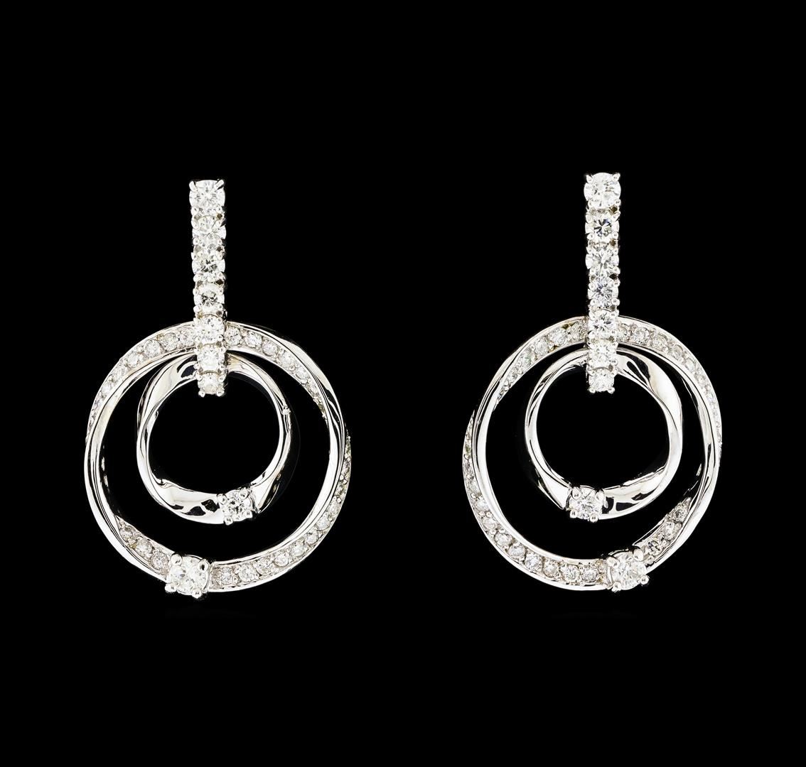 One pair electronically tested 14KT white gold lady's combination cast & assembled fashion earrings with hinged, snap locking posts with a bright polish finish. The featured ladys earrings each have two concentric circles connected at the clasp and a drop of approximately 32 millimeters. Identified with markings of 'K14'. Condition is new, good workmanship. Containing: Four prong set round brilliant cut diamonds, measuring 2.70 - 2.60 x 1.64mm (depth est.) approximate total weight of 4 Stones = 0.28ct. Graded in the setting. Clarity SI-1 to I-1. Color: H - I Cut Good Fourteen prong set round brilliant cut diamonds, measuring 2.60 - 2.20 x 1.46mm (depth est.) approximate total weight of 14 Stones = 0.73ct. Graded in the setting. Clarity SI-1 to I-1. Color: G - H Cut Good Sixty-Four prong set round brilliant cut diamonds, measuring 1.40 - 1.35 x 0.86mm (depth est.) approximate total weight of 64 Stones = 0.64ct. Graded in the setting. Clarity SI-1 to I-1. Color: G - I Cut Good. Total Weight of Diamonds 1.65ct.. Total Weight of Earrings 8.60gm. GAS Appraised at $5,410.00.