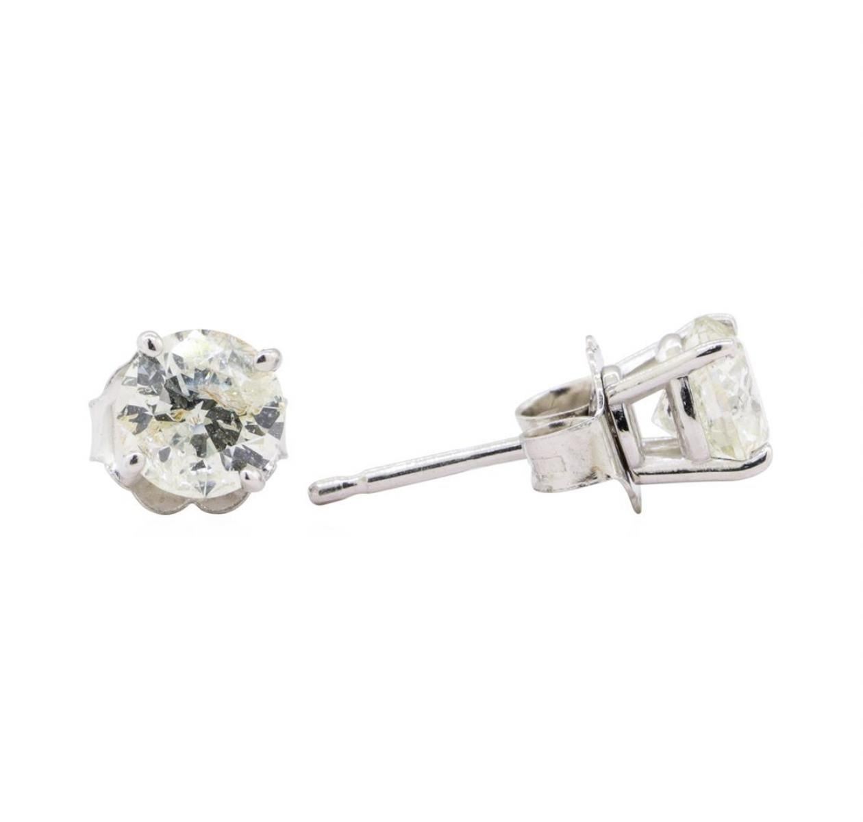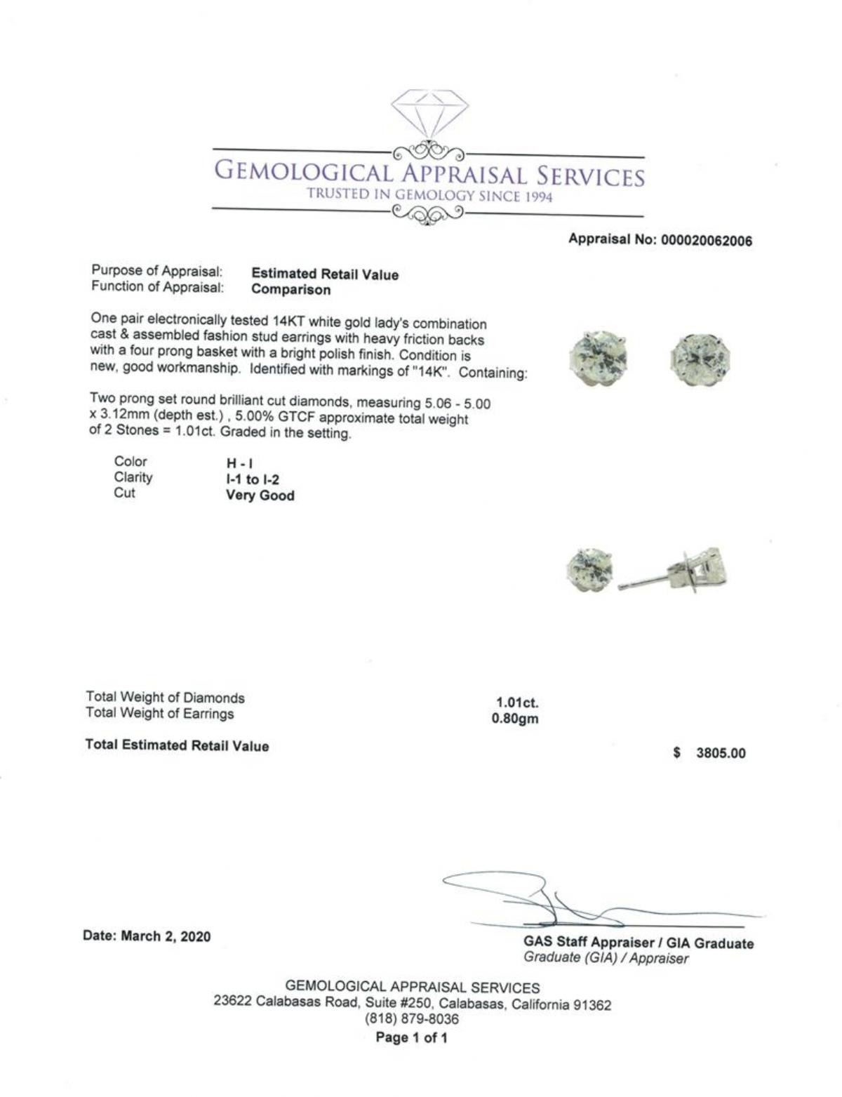 One pair electronically tested 14KT white gold lady's combination cast & assembled fashion stud earrings with heavy friction backs with a four prong basket with a bright polish finish. Identified with markings of '14K'. Condition is new, good workmanship. Containing: Two prong set round brilliant cut diamonds, measuring 5.06 - 5.00 x 3.12mm (depth est.) , 5.00.%. GTCF approximate total weight of 2 Stones = 1.01ct. Graded in the setting. Color H - I Clarity I-1 to I-2 Cut Very Good. Total Weight of Diamonds 1.01ct.. Total Weight of Earrings 0.80gm GAS Appraised at $3805.00. GAS Appraised at $3,805.00.