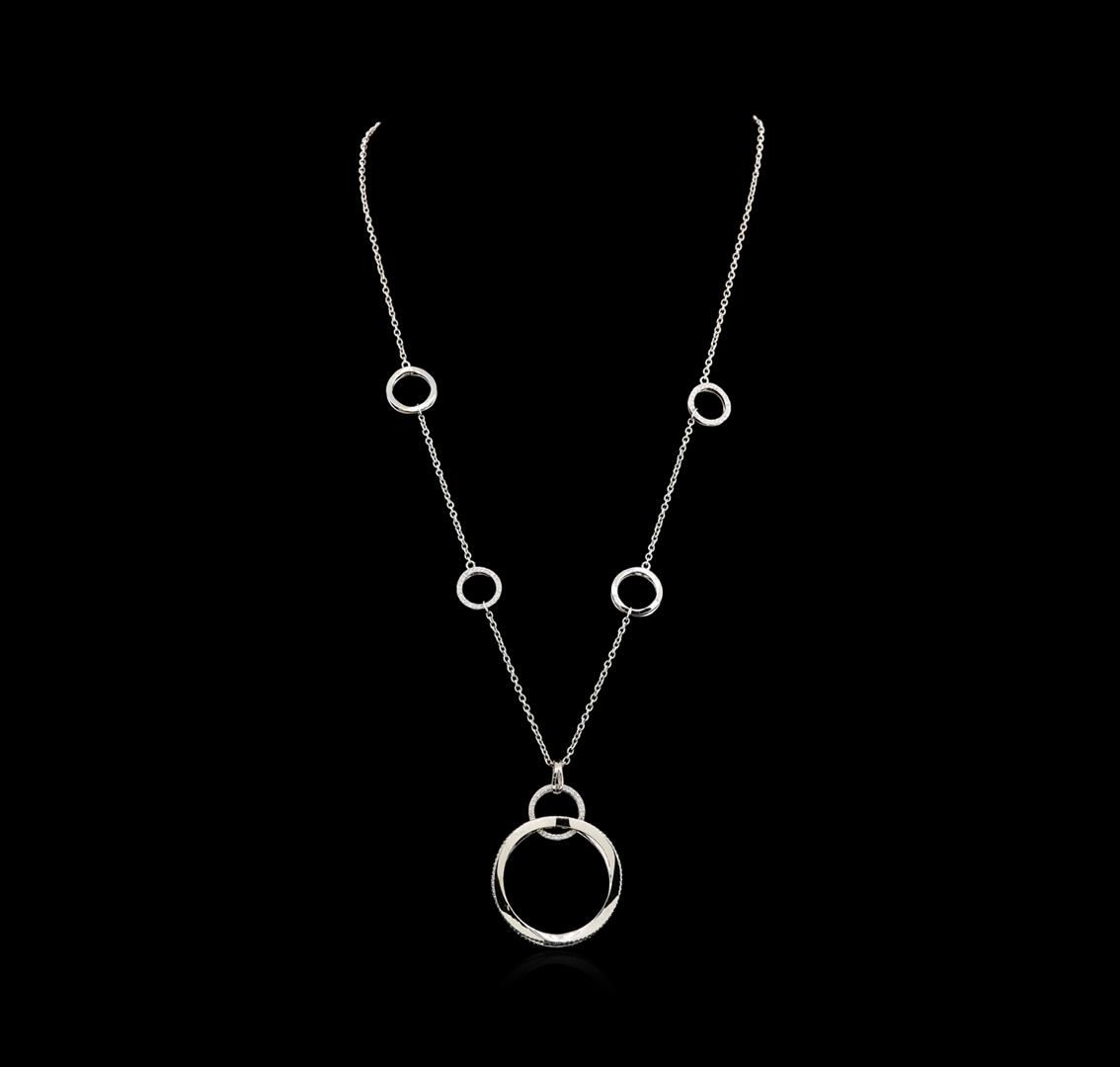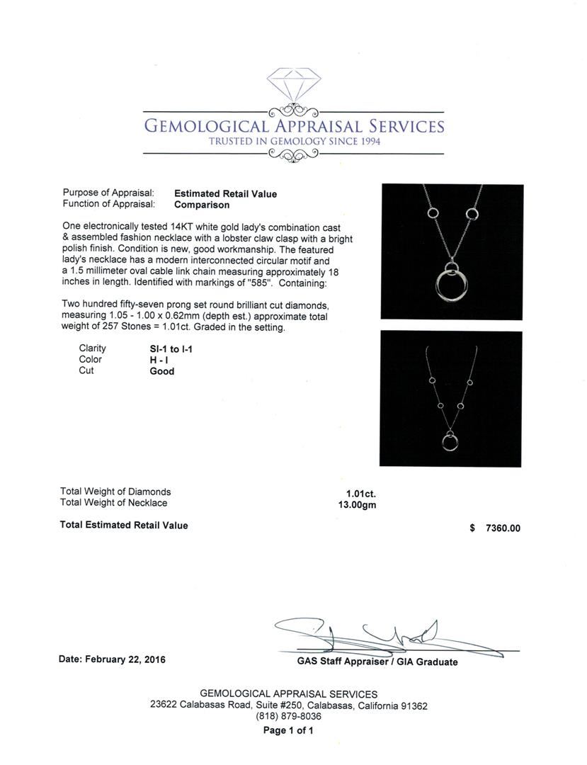 One electronically tested 14KT white gold lady's combination cast & assembled fashion necklace with a lobster claw clasp with a bright polish finish. The featured lady's necklace has a modern interconnected circular motif and a 1.5 millimeter oval cable link chain measuring approximately 18 inches in length. Identified with markings of "585". Condition is new, good workmanship. Containing: Two Hundred Fifty-Seven prong set round brilliant cut diamonds, measuring 1.05 - 1.00 x 0.62mm (depth est.) approximate total weight of 257 Stones = 1.01ct. Graded in the setting. Clarity: SI-1 to I-1. Color: H - I. Cut Good. Total Weight of Diamonds 1.01ct. Total Weight of Necklace 13.00gm. GAS Appraised at $7,360.00.