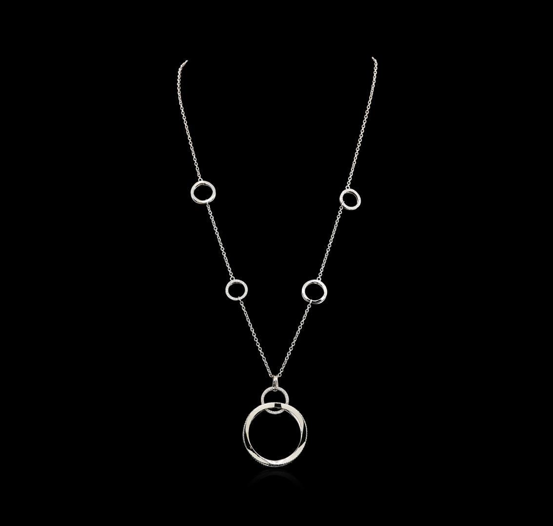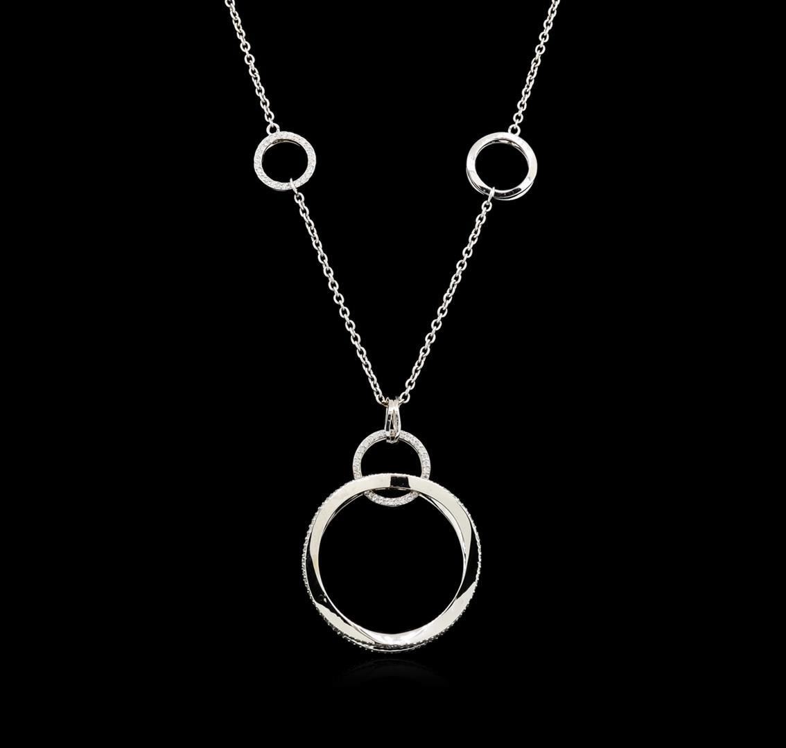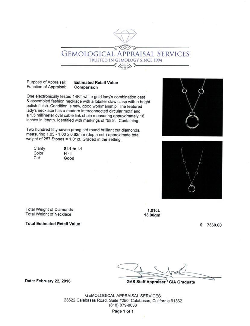 One electronically tested 14KT white gold lady's combination cast & assembled fashion necklace with a lobster claw clasp with a bright polish finish. The featured lady's necklace has a modern interconnected circular motif and a 1.5 millimeter oval cable link chain measuring approximately 18 inches in length. Identified with markings of "585". Condition is new, good workmanship. Containing: Two Hundred Fifty-Seven prong set round brilliant cut diamonds, measuring 1.05 - 1.00 x 0.62mm (depth est.) approximate total weight of 257 Stones = 1.01ct. Graded in the setting. Clarity: SI-1 to I-1. Color: H - I. Cut Good. Total Weight of Diamonds 1.01ct. Total Weight of Necklace 13.00gm. GAS Appraised.