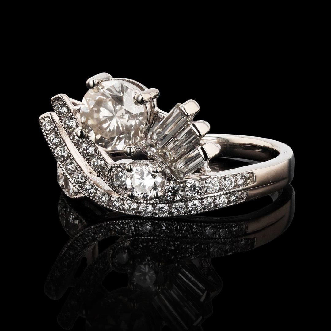 Platinum Diamond Ring One polished, stamped, and tested platinum ring with a bright finish. The ring is mounted with 1 genuine diamond center stone weighing approximately 1.01 carat, and 43 genuine faceted diamonds weighing approximately 0.79 carats. This item weighs 7.4 grams, condition is new, excellent workmanship. MAIN GEMSTONE Identity: Natural Diamond Shape: Round Cutting Style: Brilliant Cut Average Diameter: 6.2mm Weight: 1.01 carat Color Grade: I Clarity Grade: SI2 Polish: Very Good Symmetry: Very Good Refractive Index: 2.417 Hardness: 10 ADJACENT GEMSTONES ON RING Identity: Natural Diamond Cut: Baguette / Round Brilliant Quantity: 43 Diamonds Measurements: 3.2 - 5.0mm (3 baguette) 1.0 - 3.0mm (40 round) Total Weight: 0.79 carats Color Grade: F - G Clarity Grade: VS1 to SI1 Refractive Index: 2.418 Hardness: 10 CENTER DIAMOND WEIGHT: 1.01ct TOTAL DIAMOND WEIGHT: 1.80ctw WEIGHT OF ITEM: 7.4 grams METAL: Platinum Size: 6 3/4