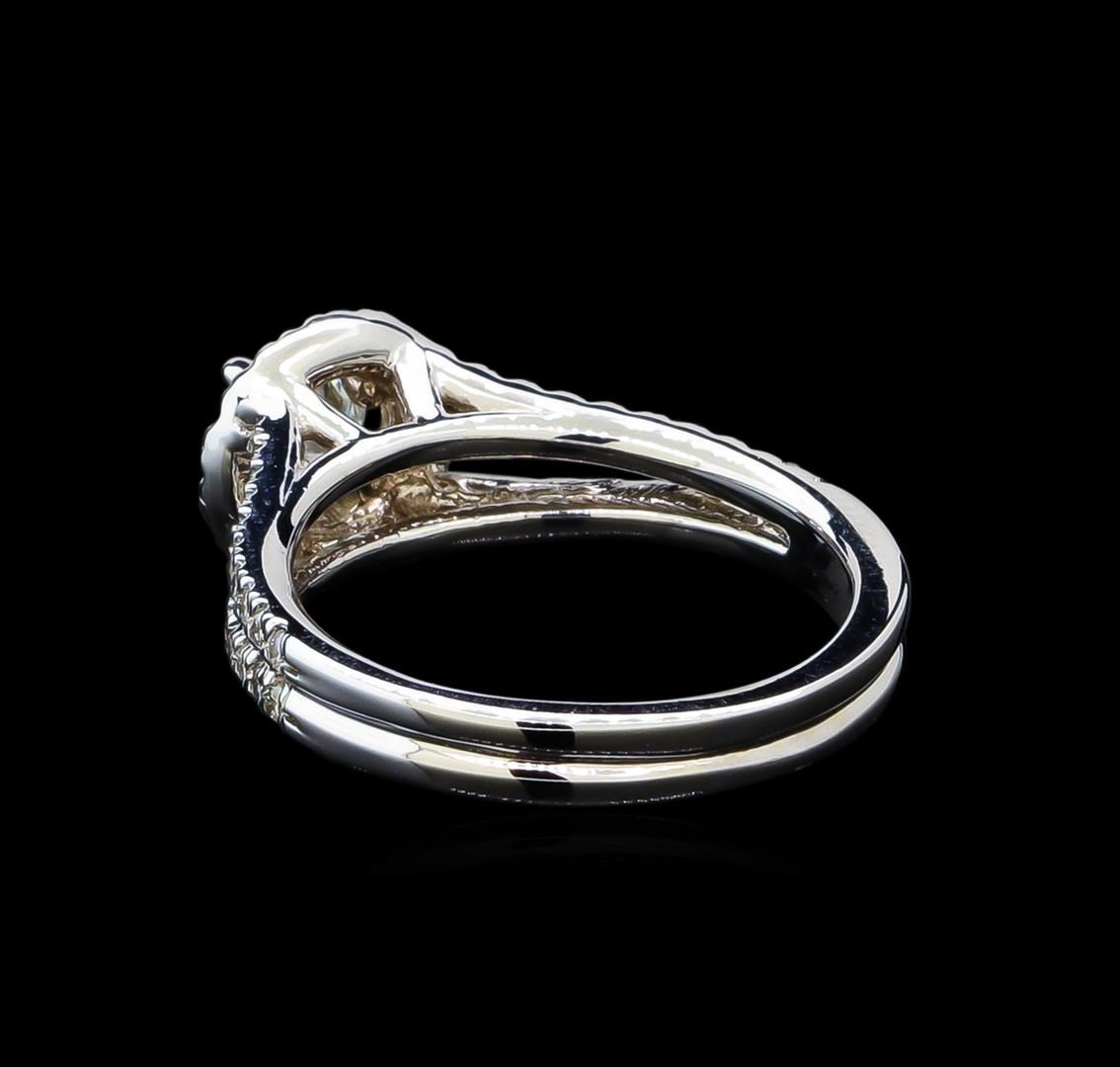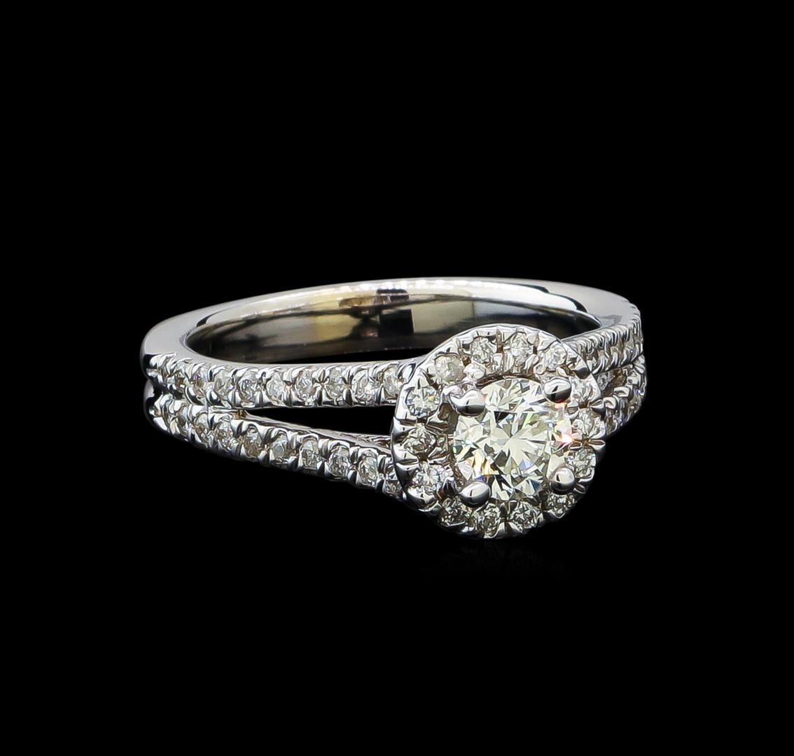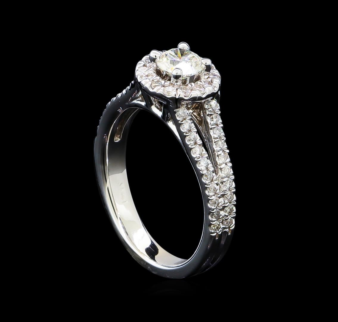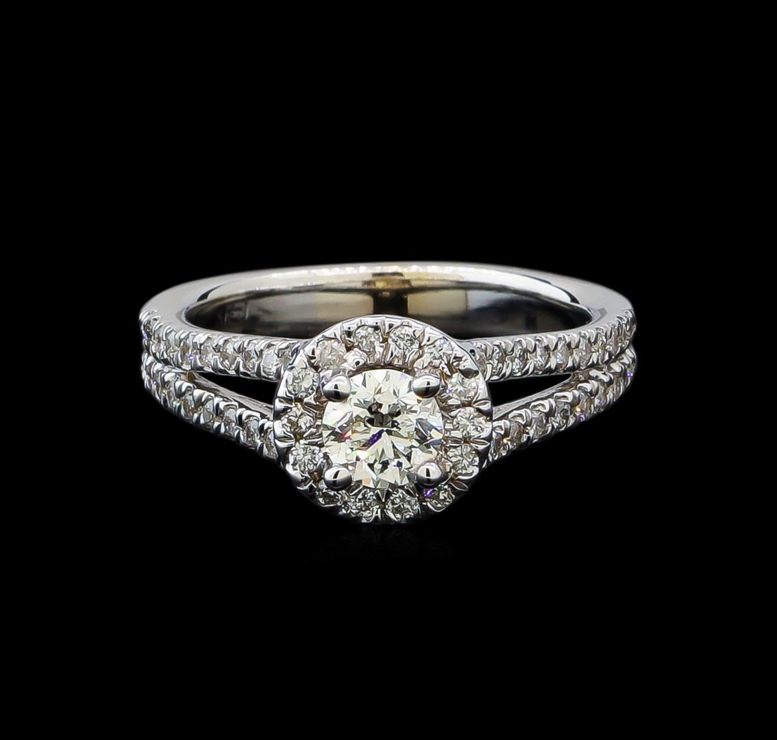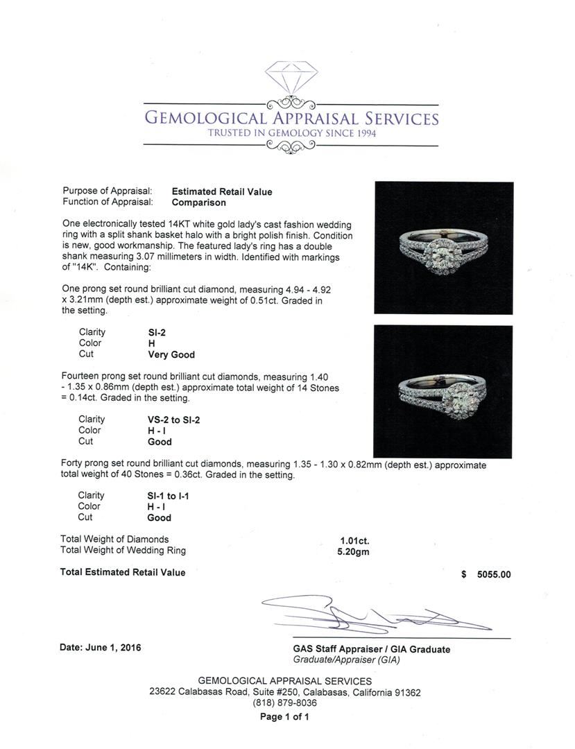 One electronically tested 14KT white gold lady's cast fashion wedding ring with a split shank basket halo with a bright polish finish. The featured lady's ring has a double shank measuring 3.07 millimeters in width. Identified with markings of "14K". Condition is new, good workmanship. Containing: One prong set round brilliant cut diamond, measuring 4.94 - 4.92 x 3.21mm (depth est.) approximate weight of 0.51ct. Graded in the setting. Clarity: SI-2. Color: Very Good Fourteen prong set round brilliant cut diamonds, measuring 1.40 - 1.35 x 0.86mm (depth est.) approximate total weight of 14 Stones = 0.14ct. Graded in the setting. Clarity: VS-2 to SI-2. Color: H - I. Cut Good Forty prong set round brilliant cut diamonds, measuring 1.35 - 1.30 x 0.82mm (depth est.) approximate total weight of 40 Stones = 0.36ct. Graded in the setting. Clarity: SI-1 to I-1. Color: H - I. Cut Good. Total Weight of Diamonds 1.01ct. Total Weight of Wedding Ring 5.20gm. GAS Appraised at $5,055.00.
