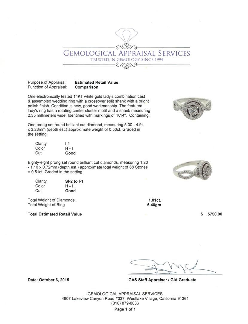 One electronically tested 14KT white gold lady's combination cast & assembled wedding ring with a crossover split shank with a bright polish finish. The featured lady's ring has a rotating center cluster motif and a shank measuring 2.35 millimeters wide. Identified with markings of "K14". Condition is new, good workmanship. Containing: One prong set round brilliant cut diamond, measuring 5.00 - 4.94 x 3.23mm (depth est.) approximate weight of 0.50ct. Graded in the setting. Clarity: I-1. Color: H - I. Cut Good Eighty-Eight prong set round brilliant cut diamonds, measuring 1.20 - 1.10 x 0.72mm (depth est.) approximate total weight of 88 Stones = 0.51ct. Graded in the setting. Clarity: SI-2 to I-1. Color: H - I. Cut Good. Total Weight of Diamonds 1.01ct. Total Weight of Ring 6.40gm, GAS Appraised at $5,750.00.