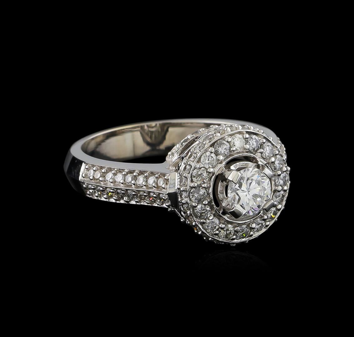 One electronically tested 14KT white gold lady's cast wedding ring with a cathedral shank with a basket halo with a bright polish finish. The featured lady's ring has a shank measuring 3.39 millimeters wide. Identified with markings of "14K". Condition is new, good workmanship. Containing: One prong set round brilliant cut diamond, measuring 4.53 - 4.51 x 2.83mm (depth est.) approximate weight of 0.35ct. Graded in the setting. Clarity: SI-1. Color: Very Good Sixteen prong set round brilliant cut diamonds, measuring 1.80 - 1.70 x 1.09mm (depth est.) approximate total weight of 16 Stones = 0.33ct. Graded in the setting. Clarity: SI-2 to I-1. Color: H - I. Cut Good Seventy-Six prong set round brilliant cut diamonds, measuring 1.10 - 1.00 x 0.65mm (depth est.) approximate total weight of 76 Stones = 0.33ct. Graded in the setting. Clarity: SI-2 to I-1. Color: H - I. Cut Good. Total Weight of Diamonds 1.01ct. Total Weight of Ring 5.60gm. GAS Appraised at $5,180.00.