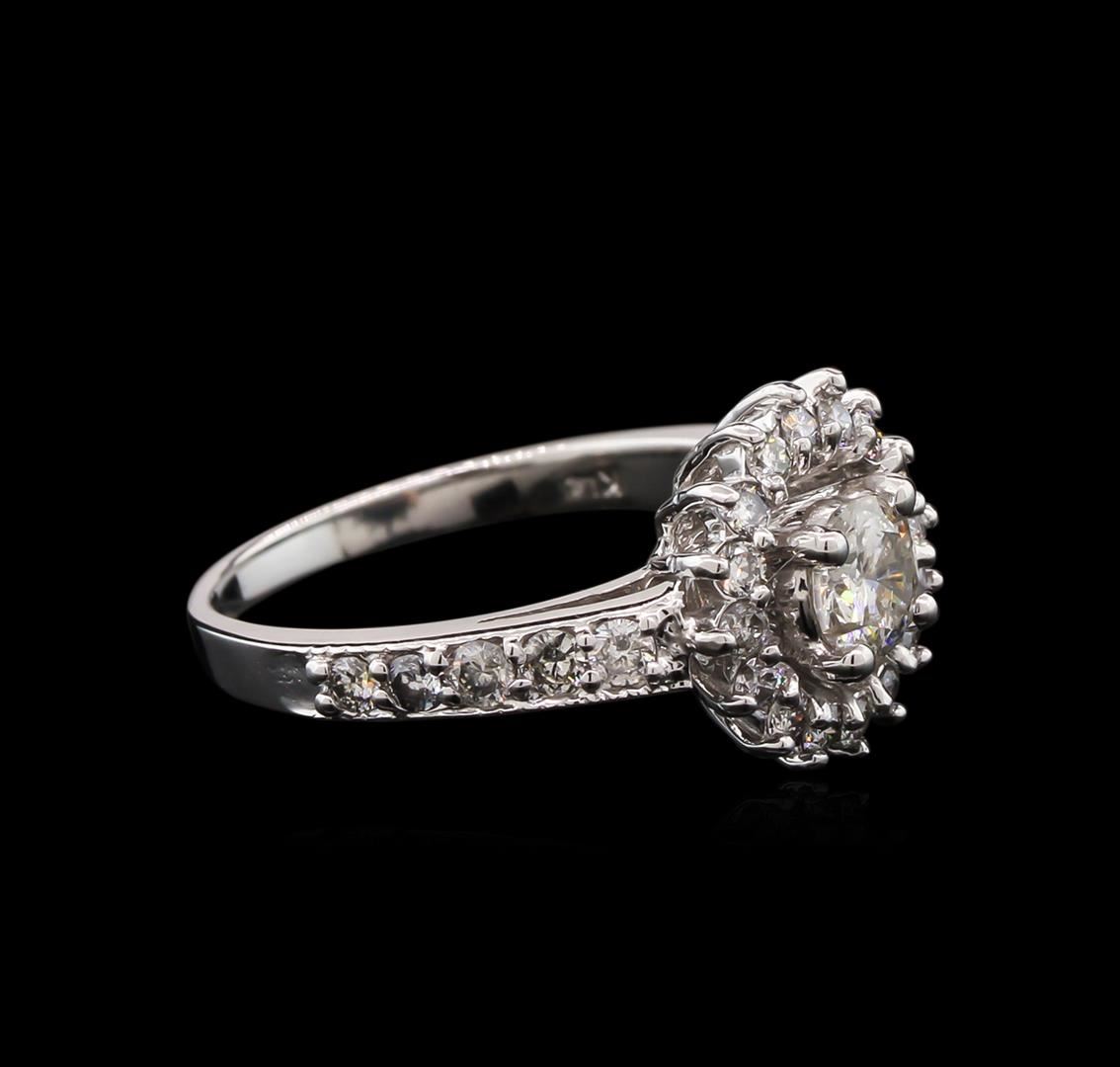 One electronically tested 14KT white gold lady's combination cast & assembled wedding ring with a basket halo with a bright polish with milgrain detailing finish. The featured lady's ring has a shank measuring 1.86 millimeters wide. Identified with markings of "K14". Condition is new, good workmanship. Containing: One prong set round brilliant cut diamond, measuring 4.96 - 4.92 x 3.01mm (depth est.) approximate weight of 0.45ct. Graded in the setting. Clarity: I-1. Color: Very Good Ten prong set round brilliant cut diamonds, measuring 2.00 - 1.80 x 1.24mm (depth est.) approximate total weight of 10 Stones = 0.30ct. Graded in the setting. Clarity: SI-2 to I-1. Color: H - I. Cut Good Sixteen prong set round brilliant cut diamonds, measuring 1.70 - 1.60 x 0.99mm (depth est.) approximate total weight of 16 Stones = 0.26ct. Graded in the setting. Clarity: SI-1 to SI-2. Color: H - I. Cut Good. Total Weight of Diamonds 1.01ct. Total Weight of Ring 3.70gm. GAS Appraised at $3,950.00.