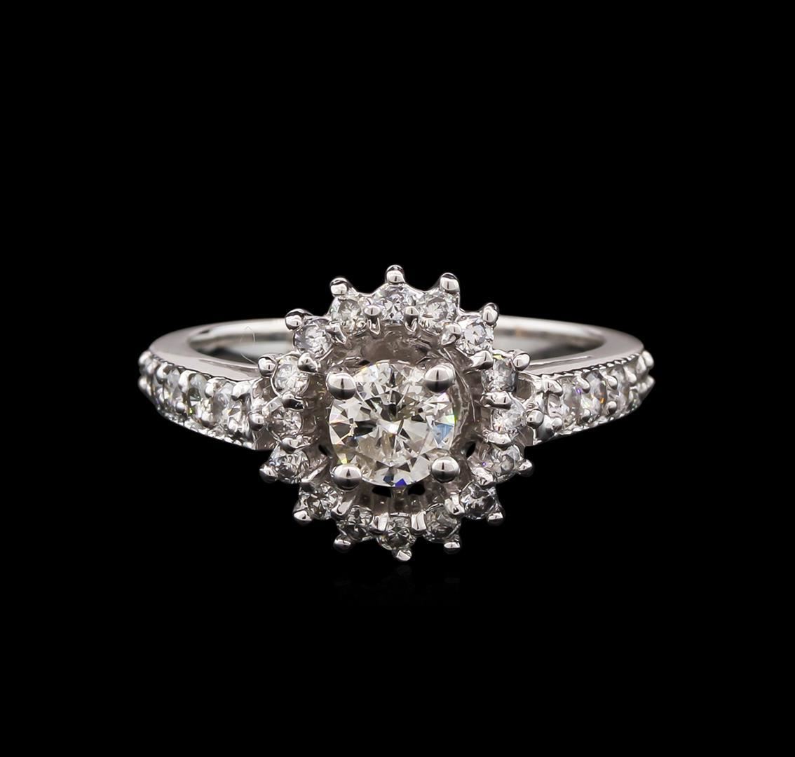One electronically tested 14KT white gold lady's combination cast & assembled wedding ring with a basket halo with a bright polish with milgrain detailing finish. The featured lady's ring has a shank measuring 1.86 millimeters wide. Identified with markings of "K14". Condition is new, good workmanship. Containing: One prong set round brilliant cut diamond, measuring 4.96 - 4.92 x 3.01mm (depth est.) approximate weight of 0.45ct. Graded in the setting. Clarity: I-1. Color: Very Good Ten prong set round brilliant cut diamonds, measuring 2.00 - 1.80 x 1.24mm (depth est.) approximate total weight of 10 Stones = 0.30ct. Graded in the setting. Clarity: SI-2 to I-1. Color: H - I. Cut Good Sixteen prong set round brilliant cut diamonds, measuring 1.70 - 1.60 x 0.99mm (depth est.) approximate total weight of 16 Stones = 0.26ct. Graded in the setting. Clarity: SI-1 to SI-2. Color: H - I. Cut Good. Total Weight of Diamonds 1.01ct. Total Weight of Ring 3.70gm. GAS Appraised.