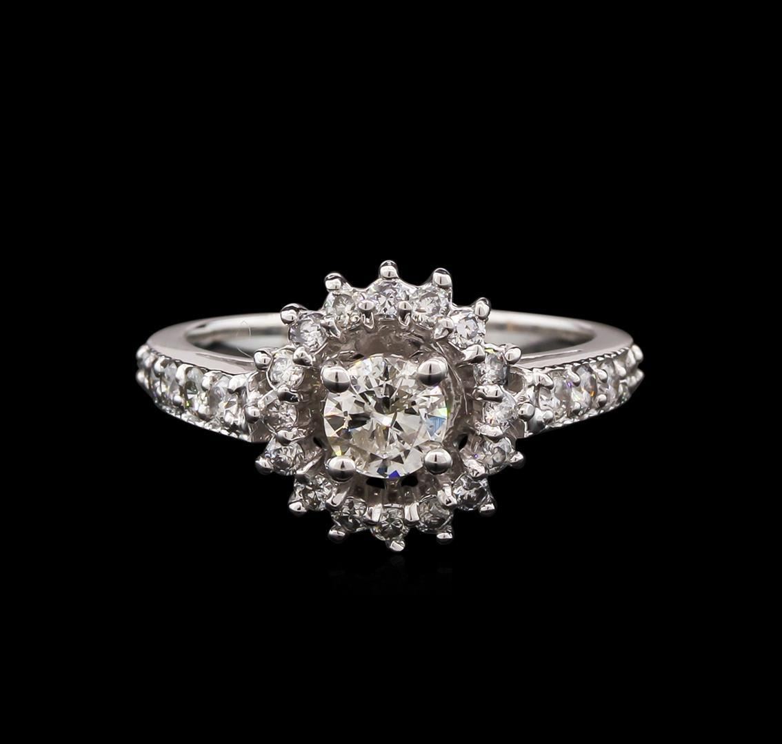 One electronically tested 14KT white gold lady's combination cast & assembled wedding ring with a basket halo with a bright polish with milgrain detailing finish. The featured lady's ring has a shank measuring 1.86 millimeters wide. Identified with markings of "K14". Condition is new, good workmanship. Containing: One prong set round brilliant cut diamond, measuring 4.96 - 4.92 x 3.01mm (depth est.) approximate weight of 0.45ct. Graded in the setting. Clarity: I-1. Color: Very Good Ten prong set round brilliant cut diamonds, measuring 2.00 - 1.80 x 1.24mm (depth est.) approximate total weight of 10 Stones = 0.30 ct. Graded in the setting. Clarity: SI-2 to I-1. Color: H - I. Cut Good Sixteen prong set round brilliant cut diamonds, measuring 1.70 - 1.60 x 0.99mm (depth est.) approximate total weight of 16 Stones = 0.26ct. Graded in the setting. Clarity: SI-1 to SI-2. Color: H - I. Cut Good. Total Weight of Diamonds 1.01ct. Total Weight of Ring 3.70gm. GAS Appraised.
