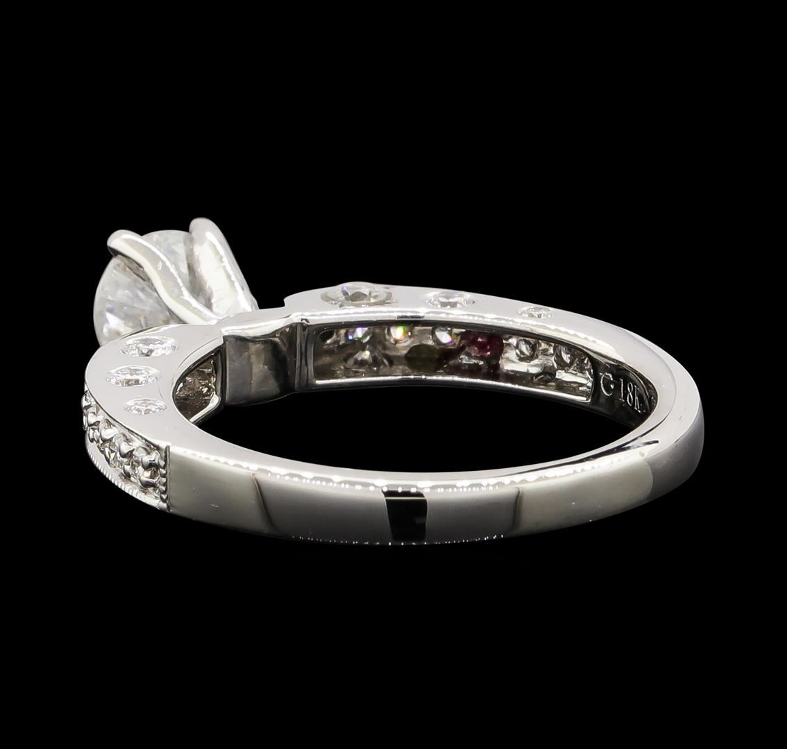 One electronically tested 18KT white gold lady's cast straight line wedding ring with a bright polish with milgrain detailing finish. The featured lady's ring has raised and scalloped shoulders and a shank measuring 2.44 millimeters wide. Identified with markings of '18K'. Condition is new, good workmanship. Containing: One prong set round brilliant cut diamond, measuring 5.31 - 5.28 x 3.55mm (depth est.) approximate weight of 0.61ct. Graded in the setting. Clarity I-1. Color: G Cut Very Good Eight bezel set round brilliant cut diamonds, measuring 2.25 - 1.85 x 1.23mm (depth est.) approximate total weight of 8 Stones = 0.25ct. Graded in the setting. Clarity VS-1 to SI-1. Color: G - H Cut Very Good Twenty prong set round brilliant cut diamonds, measuring 1.30 - 1.20 x 0.78mm (depth est.) approximate total weight of 20 Stones = 0.15ct. Graded in the setting. Clarity VS-1 to SI-1. Color: G - H Cut Good. Total Weight of Diamonds 1.01ct.. Total Weight of Ring 4.40gm. GAS Appraised at $4,940.00.