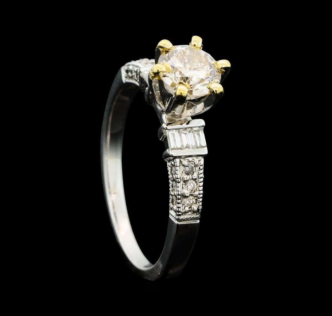 One electronically tested 18KT yellow and white gold lady's combination cast & assembled wedding ring with a tapered cathedral shank with a bright polish with milgrain detailing finish. The featured lady's ring has a shank measuring 1.62 millimeters wide. Identified with markings of '18K'. Condition is new, good workmanship. Containing: One prong set round brilliant cut diamond, measuring 5.85 - 5.83 x 3.68mm (depth est.) approximate weight of 0.77ct. Graded in the setting. Clarity I-1. Color: J - K Cut Good Eighteen prong set round brilliant cut diamonds, measuring 1.20 - 1.10 x 0.69mm (depth est.) approximate total weight of 18 Stones = 0.10ct. Graded in the setting. Clarity VS-2 to SI-1. Color: G - H Cut Good Six channel set baguette cut diamonds, measuring from 2.10 x 1.15 x 0.98mm (depth est.) to 2.20 x 1.20 x 1.02mm (depth est.) approximate total weight of 6 Stones = 0.14ct. Graded in the setting. Clarity VS-1 to VS-2. Color: F - G Cut Very Good. Total Weight of Diamonds 1.01ct.. Total Weight of Ring 4.00gm. GAS Appraised at $5,190.00.