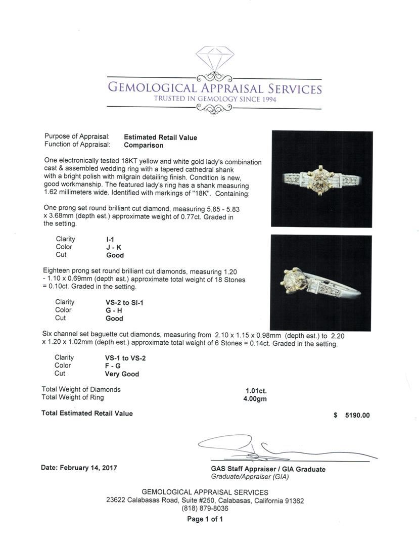 One electronically tested 18KT yellow and white gold lady's combination cast & assembled wedding ring with a tapered cathedral shank with a bright polish with milgrain detailing finish. The featured lady's ring has a shank measuring 1.62 millimeters wide. Identified with markings of '18K'. Condition is new, good workmanship. Containing: One prong set round brilliant cut diamond, measuring 5.85 - 5.83 x 3.68mm (depth est.) approximate weight of 0.77ct. Graded in the setting. Clarity I-1. Color: J - K Cut Good Eighteen prong set round brilliant cut diamonds, measuring 1.20 - 1.10 x 0.69mm (depth est.) approximate total weight of 18 Stones = 0.10ct. Graded in the setting. Clarity VS-2 to SI-1. Color: G - H Cut Good Six channel set baguette cut diamonds, measuring from 2.10 x 1.15 x 0.98mm (depth est.) to 2.20 x 1.20 x 1.02mm (depth est.) approximate total weight of 6 Stones = 0.14ct. Graded in the setting. Clarity VS-1 to VS-2. Color: F - G Cut Very Good. Total Weight of Diamonds 1.01ct.. Total Weight of Ring 4.00gm. GAS Appraised at $5,190.00.