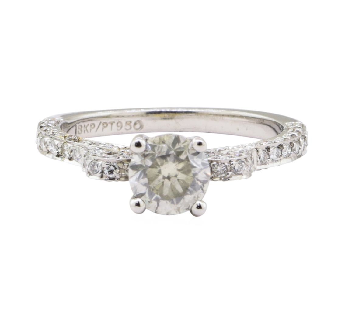 One electronically tested platinum ladies cast & assembled diamond unity ring. The featured diamond is set within elaborate diamond set shoulders, completed by a two millimeter wide band. Bright polish finish, milgrain detailing, and 18KT yellow gold accents. Condition is new, good workmanship. Containing: One prong set round brilliant cut diamond, measuring 6.20 - 6.10 x 4.20mm (depth est.) approximate weight of 1.01ct. Graded in the setting. Clarity I-1 Color G Depth 68.3% Table 58.5% Eighty-Four prong set round brilliant cut diamonds, measuring 1.20 - 1.20 x 0.72mm (depth est.) approximate total weight of 84 Stones = 0.55ct. The clarity & color grade reflect the overall average for the group. Graded in the setting. Clarity SI-1 to SI-2 Color F - H Total Weight of Diamonds 1.56 ct. Total Weight of Ring 8.18 gm Estimated Retail Value $ 14,440.00 US