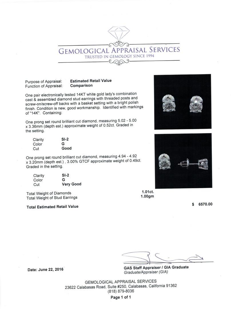 One pair electronically tested 14KT white gold lady's combination cast & assembled diamond stud earrings with threaded posts and screw-on/screw-off backs with a basket setting with a bright polish finish. Identified with markings of "14K". Condition is new, good workmanship. Containing: One prong set round brilliant cut diamond, measuring 5.02 - 5.00 x 3.36mm (depth est.) approximate weight of 0.52ct. Graded in the setting. Clarity: SI-2. Color: Good One prong set round brilliant cut diamond, measuring 4.94 - 4.92 x 3.20mm (depth est.) , 3.00.%. GTCF approximate weight of 0.49ct. Graded in the setting. Clarity: SI-2. Color: Very Good. Total Weight of Diamonds 1.01ct. Total Weight of Stud Earrings 1.00gm. GAS Appraised at $6,570.00.