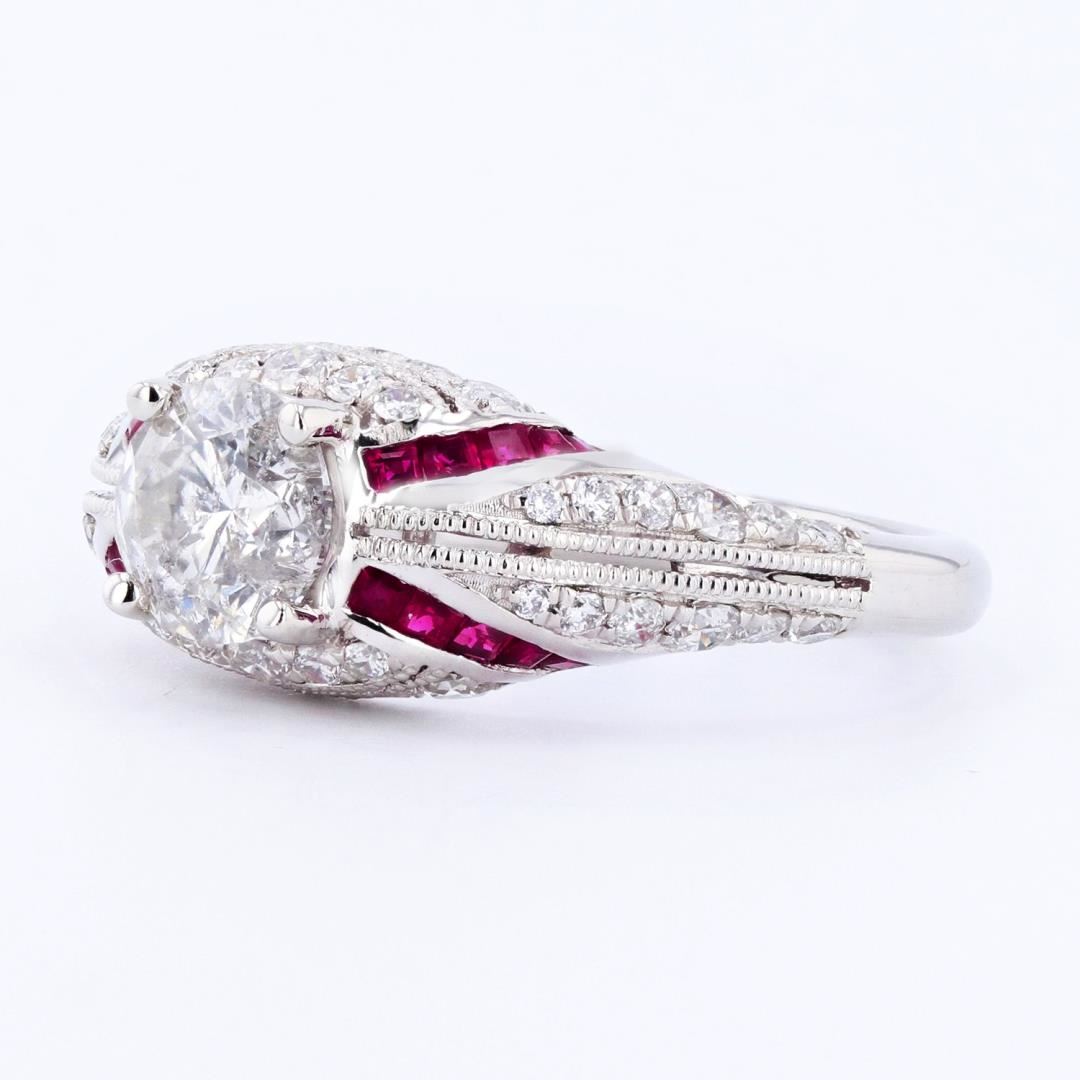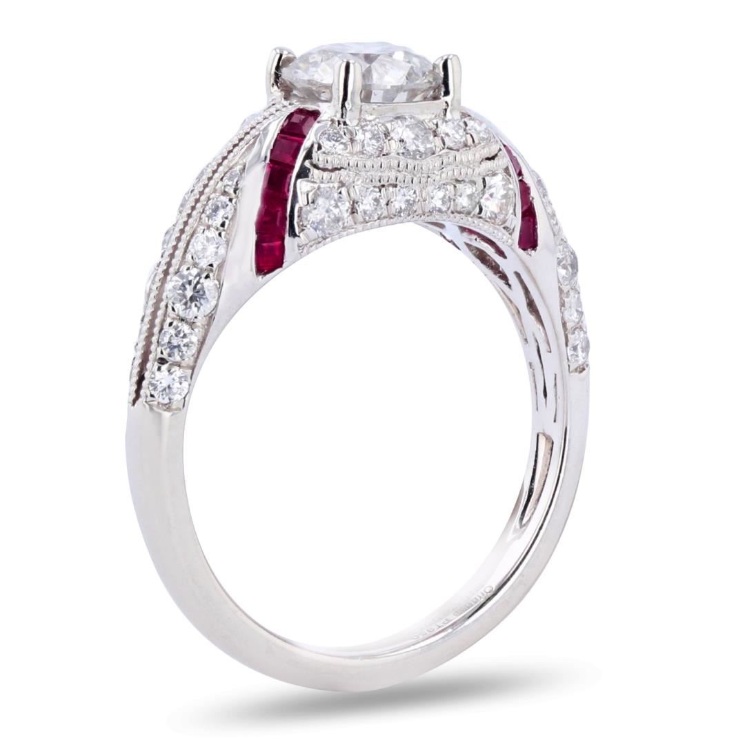 One electronically tested platinum ladies cast diamond & ruby unity ring. The featured diamond is set within an elaborate diamond & ruby gallery, supported by a lattice under gallery, completed by a two millimeter wide band. Bright polish finish with mil