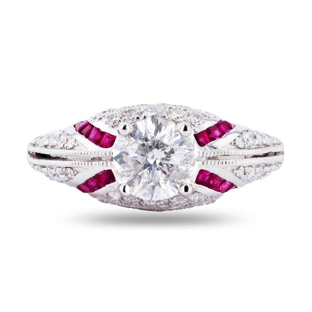 One electronically tested platinum ladies cast diamond & ruby unity ring.  The featured diamond is set within an elaborate diamond & ruby gallery, supported by a lattice under gallery, completed by a two millimeter wide band. Bright polish finish with milgrain detailing throughout. Trademark is Orianne. Identified with markings of "PT950" Containing:  One prong set round brilliant cut diamond, measuring 6.38 - 6.33 x 4.00mm (depth est.), 2.00% GTCF approximate weight of 1.01ct. Graded in the setting.  Clarity I2  Color G  Depth 62.9%  Table 56.6%  Polish Good  Symmetry Good  Twenty channel set square step cut natural rubies, measuring 1.40 x 1.30 x 0.84mm, approximate total weight of 0.47ctw., clarity is slightly included, type II, medium dark, slightly brownish, strongly purplish red color, (GIA stpR 6/2), cut is good. Transmitting light with no distortion, transparent. Naturally occurring internal & external characteristics are present. Graded in the setting.  Forty-six prong set round brilliant cut diamonds, measuring 1.90 - 1.00 x 0.87mm (depth est.) approximate total weight of 46 Stones = 0.65ctw. Graded in the setting.  Clarity I1 to I2  Color F - H  Total Weight of Colored Stones 0.47ctw. Total Weight of Diamonds 1.66ctw. Total Weight of Unity Ring 6.20 gm Size: 6 3/4