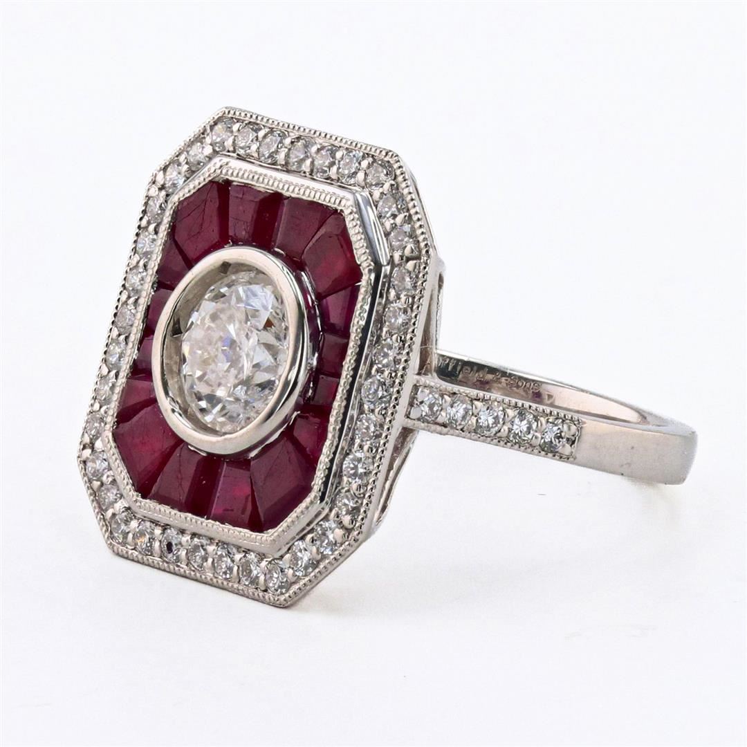 1.01ct Diamond and 2.11ctw Ruby Platinum Ring (1.48ctw Diamonds). Name of Article: Lady's Diamond and Ruby Ring Setting: Platinum Mounting [8.00 gms] Cut: Round Brilliant Color: J Clarity: I2 Measurements: 6.90 x 6.80 x 3.98mm Approximate Weight: 1.01 Carat Additional Stones/Information: 36 Round Diamonds = Approx. 0.47 Cts. TWT (Color: F-G, Clarity: VS-SI) 16 Step Cut Rubies = Approx. 2.11 Cts. TWT (Color: Red, Transparency: Transparent)