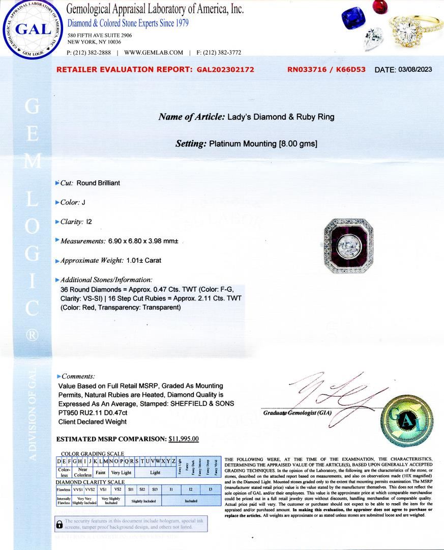 Name of Article: Lady's Diamond and Ruby Ring Setting: Platinum Mounting [8.00 gms] Cut: Round Brilliant Color: J Clarity: I2 Measurements: 6.90 x 6.80 x 3.98mm Approximate Weight: 1.01 Carat #Additional Stones/Information:# 36 Round Diamonds = Approx. 0.47 Cts. TWT (Color: F-G, Clarity: VS-SI) 16 Step Cut Rubies = Approx. 2.11 Cts. TWT (Color: Red, Transparency: Transparent) #LREF-6653