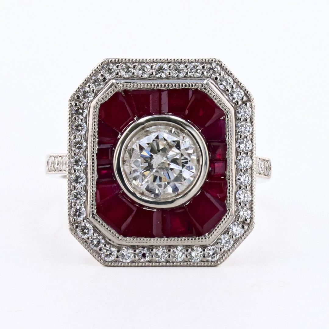 Name of Article: Lady's Diamond and Ruby Ring Setting: Platinum Mounting [8.00 gms] Cut: Round Brilliant Color: J Clarity: I2 Measurements: 6.90 x 6.80 x 3.98mm Approximate Weight: 1.01 Carat #Additional Stones/Information:# 36 Round Diamonds = Approx. 0.47 Cts. TWT (Color: F-G, Clarity: VS-SI) 16 Step Cut Rubies = Approx. 2.11 Cts. TWT (Color: Red, Transparency: Transparent) #LREF-6653
