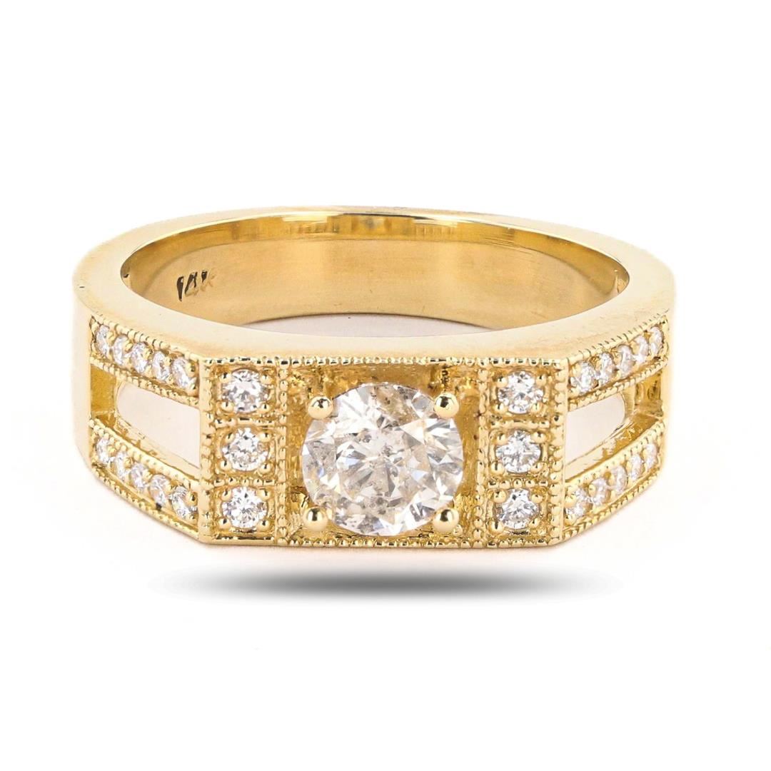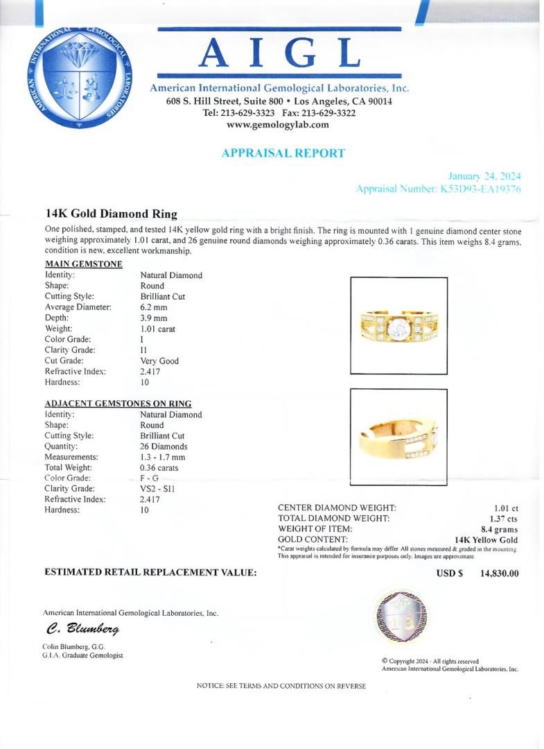 One polished. stamped, and tested 14K yellow gold ring with a bright finish. The ring is mounted with 1 genuine diamond center stone weighing approximately 1.01 carat, and 26 genuine round diamonds weighing approximately 0.36 carats. This item weighs 8.4 grams, condition is new, excellent workmanship. #MAIN GEMSTONE# Identity: Natural Diamond Shape: Round Cutting Style: Brilliant Cut Average Diameter: 6.2mm Depth: 3.9mm Weight: 1.01 carat Color Grade: I Clarity Grade: I1 Cut Grade: Very Good Refractive Index: 2.417 Hardness: 10 #ADJACENT GEMSTONES ON RING# Identity: Natural Diamond Shape: Round Cutting Style: Brilliant Cut Quantity: 26 Diamonds Measurements: 1.3 - 1.7mm Total Weight: 0.36 carats Color Grade: F-G Clarity Grade: VS2- SI1 Refractive Index: 2.417 Hardness: 10 CENTER DIAMOND WEIGHT: 1.01 ct TOTAL DIAMOND WEIGHT: 1.37 cts WEIGHT OF ITEM: 8.4 grams GOLD CONTENT: 14K Yellow Gold Size: 10 1/4