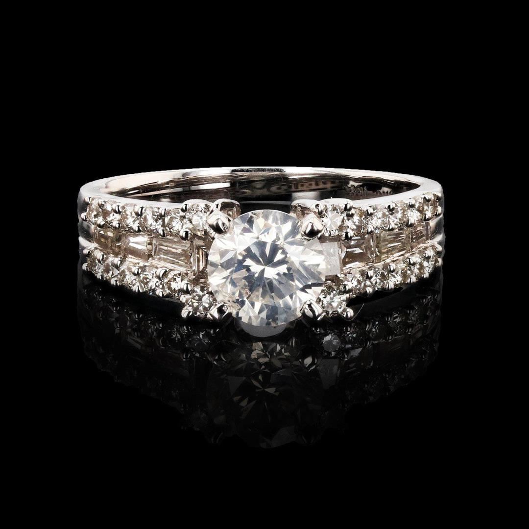 One electronically tested 18KT white gold ladies cast diamond unity ring with a bright polish finish. Condition is new, good workmanship. The featured diamond is supported by diamond set shoulders, completed by a two millimeter wide band. Trademark is Orianne. Identified with markings of "14K". Containing: One prong set round brilliant cut diamond, measuring 6.24mm to 6.21mm x 4.13mm exact weight 1.01ct. Laser inscribed EGL US905749002D. EGL Report attached. Graded loose prior to setting in the EGL Laboratory Report #US 905749002D. Clarity SI3 Color G Depth 66.3% Table 58.0% Pavil. Depth% 45.3% Crown Angle 36.5 Degrees Thirty-two prong and channel set round brilliant and baguette cut diamonds approximate total weight of 32 Stones = 0.78ct. Graded in the setting. Clarity VS2 to SI2 Colnr H - J Total Weight of Diamonds 1.79ct. Total Weight of Ring 4.18 gm #LREF-8818