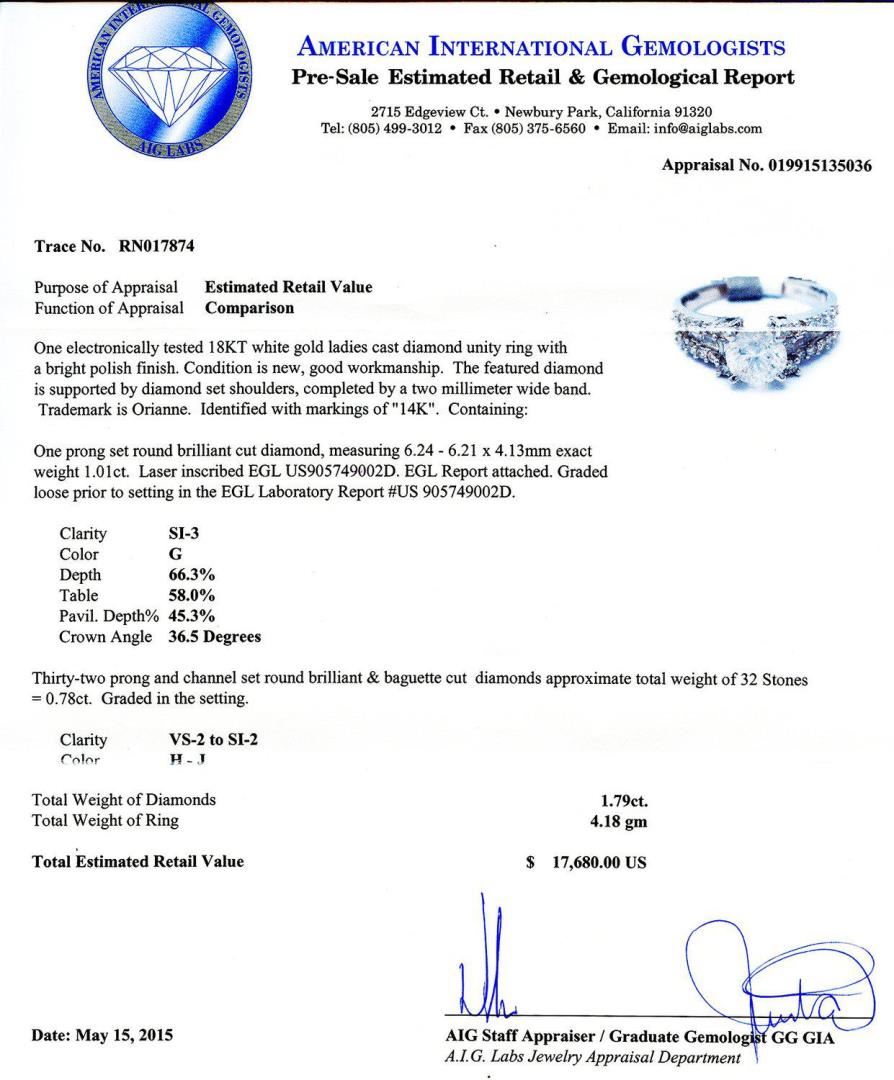 One electronically tested 18KT white gold ladies cast diamond unity ring with a bright polish finish. Condition is new, good workmanship. The featured diamond is supported by diamond set shoulders, completed by a two millimeter wide band. Trademark is Orianne. Identified with markings of "14K". Containing: One prong set round brilliant cut diamond, measuring 6.24mm to 6.21mm x 4.13mm exact weight 1.01ct. Laser inscribed EGL US905749002D. EGL Report attached. Graded loose prior to setting in the EGL Laboratory Report #US 905749002D. Clarity SI3 Color G Depth 66.3% Table 58.0% Pavil. Depth% 45.3% Crown Angle 36.5 Degrees Thirty-two prong and channel set round brilliant and baguette cut diamonds approximate total weight of 32 Stones = 0.78ct. Graded in the setting. Clarity VS2 to SI2 Colnr H - J Total Weight of Diamonds 1.79ct. Total Weight of Ring 4.18 gm #Size: 7