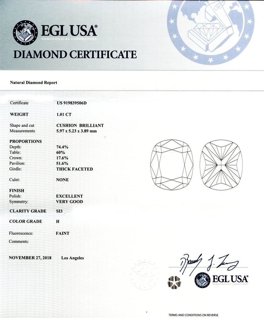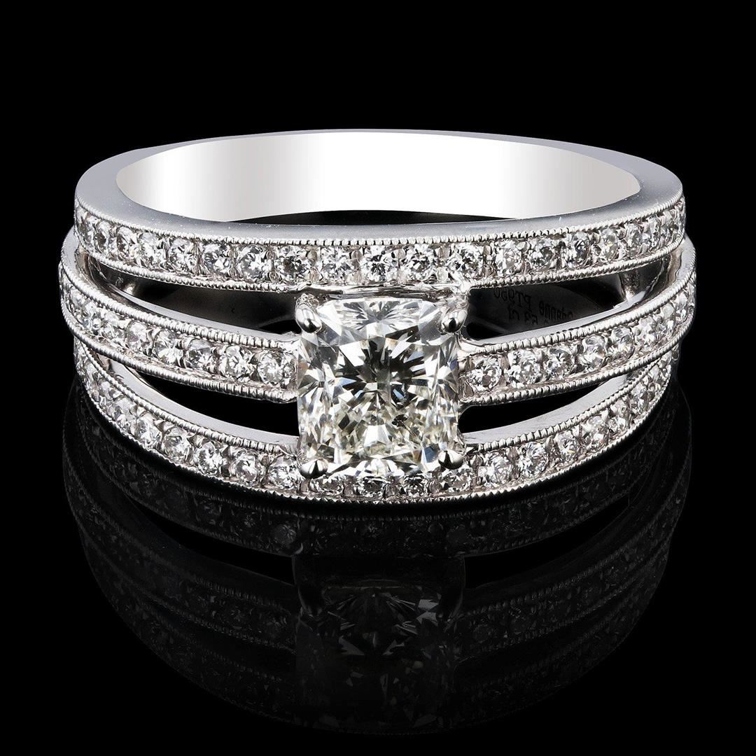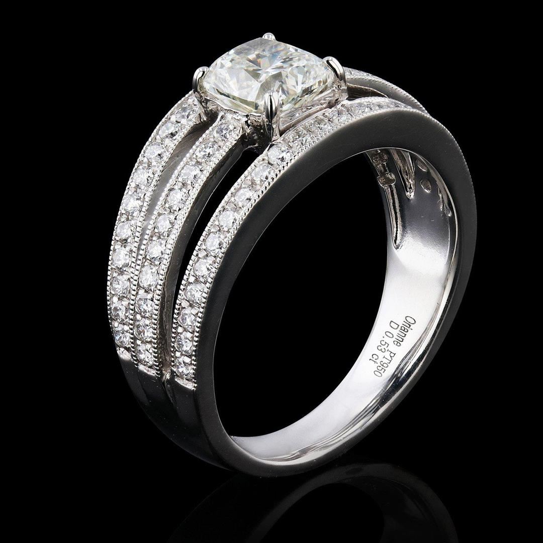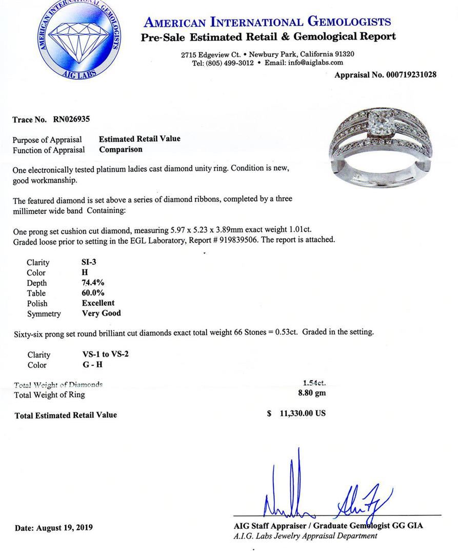 One electronically tested platinum ladies cast diamond unity ring. Condition is new, good workmanship. The featured diamond is set above a series of diamond ribbons, completed by a three millimeter wide band Containing: One prong set cushion cut diamo