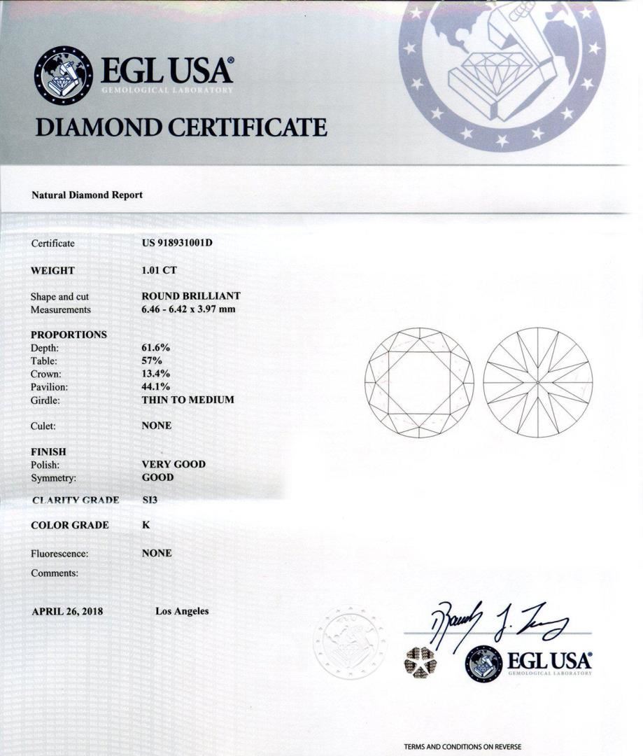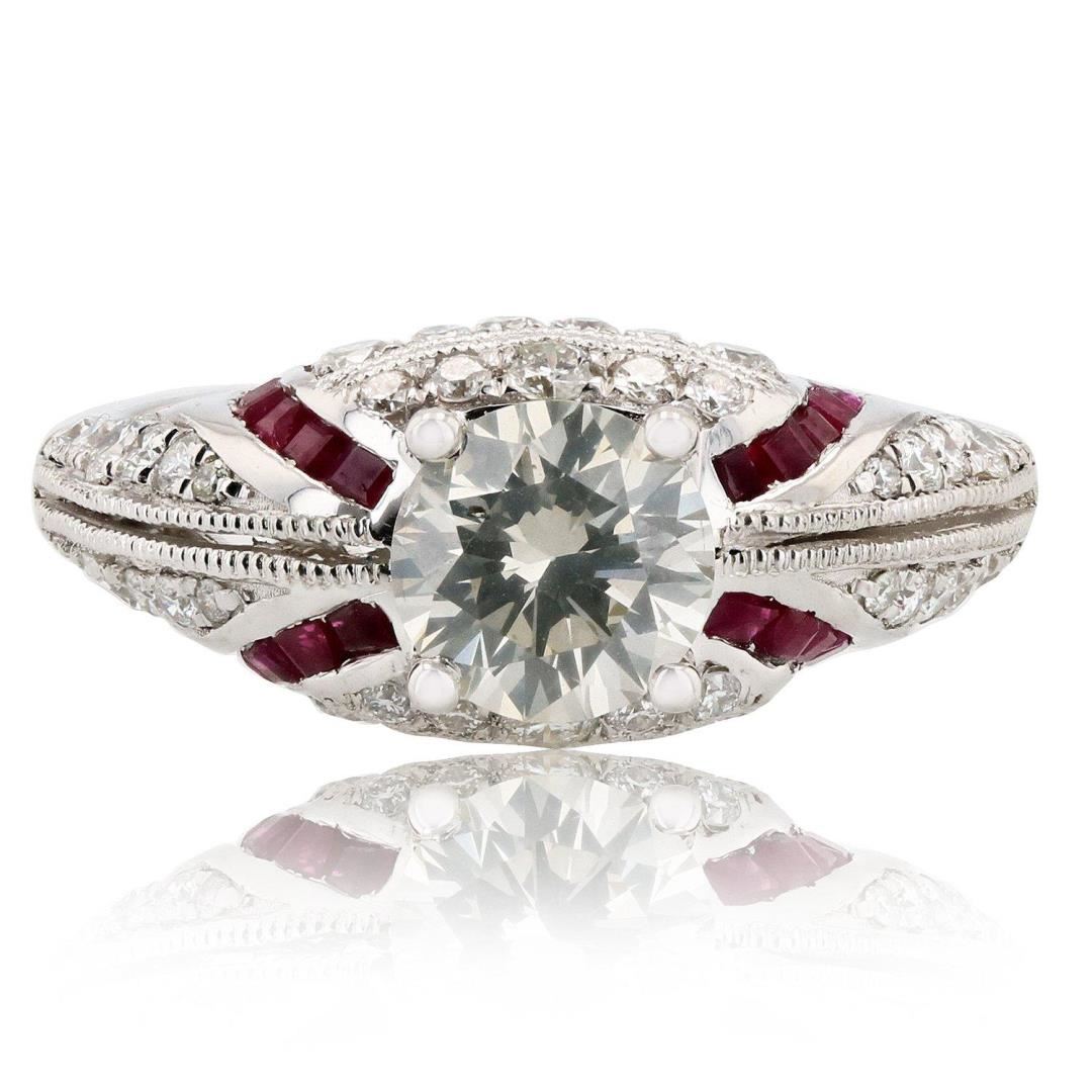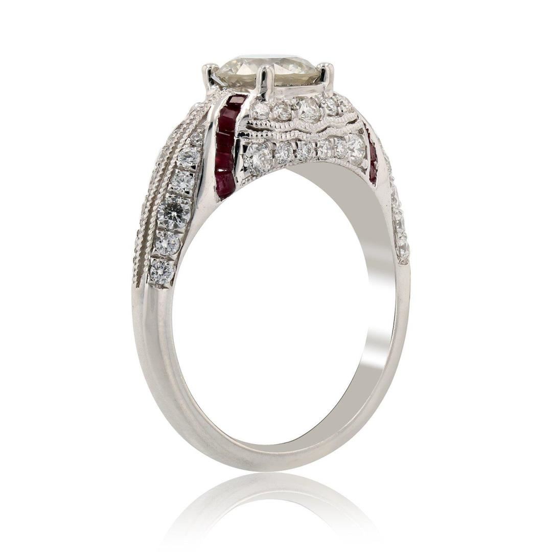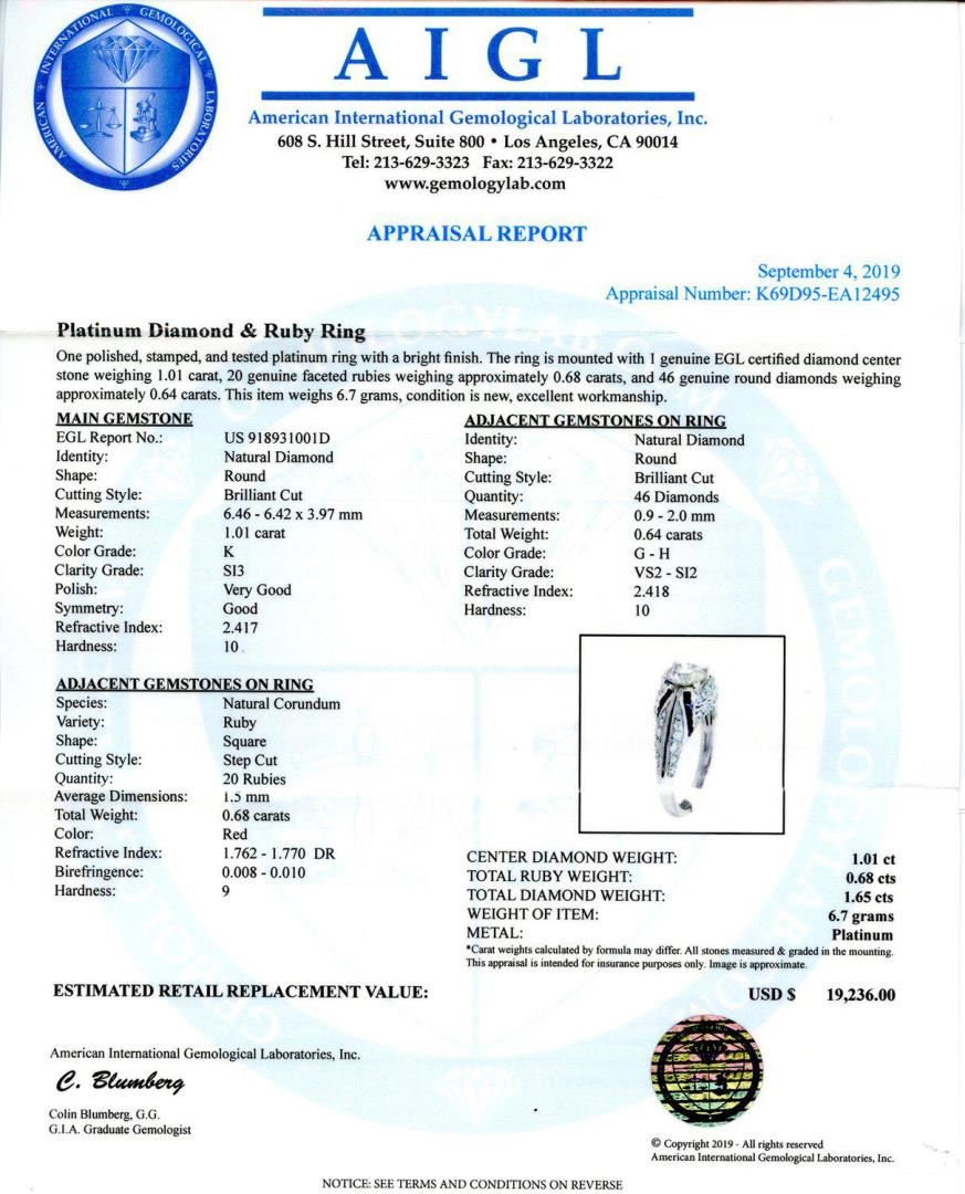 Platinum Diamond and Ruby Ring One polished, stamped, and tested platinum ring with a bright finish. The ring is mounted with 1 genuine EGL certified diamond center stone weighing 1.01 carat, 20 genuine faceted rubies weighing approximately 0.68 carats, and 46 genuine round diamonds weighing approximately 0.64 carats. This item weighs 6.7 grams, condition is new, excellent workmanship. MAIN GEMSTONE EGL Report No.: US 918931001D Identity: Natural Diamond Shape: Round Cutting Style: Brilliant Cut Measurements: 6.46 - 6.42 x 3.97 mm Weight: 1.01 carat Color Grade: K Clarity Grade: SI3 Polish: Very Good Symmetry: Good Refractive Index: 2.417 Hardness: 10 ADJACENT GEMSTONES ON RING Identity: Natural Diamond Shape: Round Cutting Style: Brilliant Cut Quantity: 46 Diamonds Measurement: 0.9 - 2.0 mm Total Weight: 0.64 carats Color Grade: G - H Clarity Grade: VS2 - SI2 Refractive Index: 2.418 Hardness: 10 ADJACENT GEMSTONES ON RING Species: Natural Corundum Variety: Ruby Shape: Square Cutting Style: Step Cut Quantity: 20 Rubies Average Dimensions: 1.5 mm Total Weight: 0.68 carats Color: Red Refractive Index: 1.762 - 1.770 DR Birefringence: 0.008 - 0.010 Hardness: 9 CENTER DIAMOND WEIGHT: 1.01 ct TOTAL RUBY WEIGHT: 0.68 cts TOTAL DIAMOND WEIGHT: 1.65 cts WEIGHT OF ITEM: 6.7 grams METAL: Platinum Size: 6 1/2