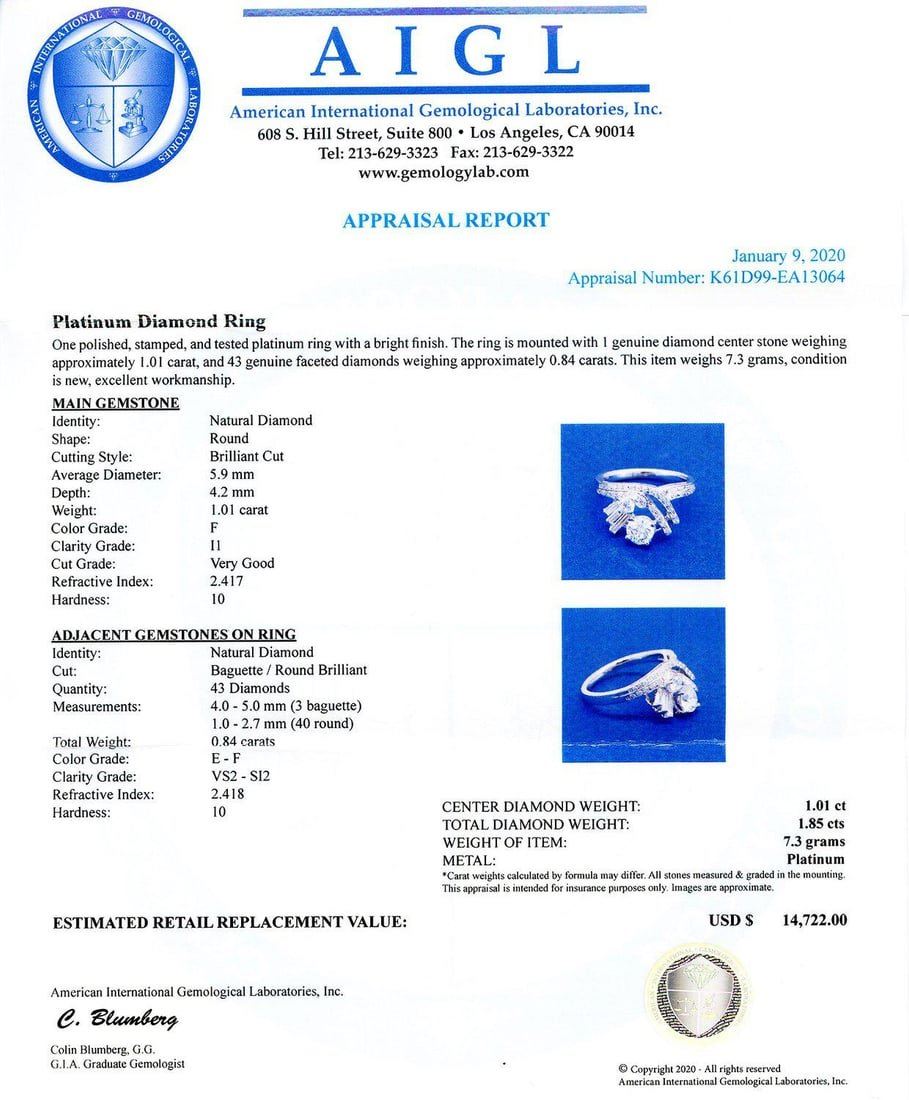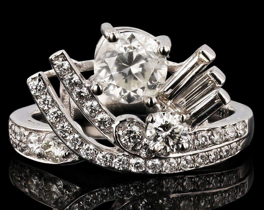 Platinum Diamond Ring One polished, stamped, and tested platinum ring with a bright finish. The ring is mounted with 1 genuine diamond center stone weighing approximately 1.01 carat, and 43 genuinefaceted diamonds weighing approximately 0.84 carats. This item weighs 7.3 grams, condition is new, excellent workmanship. MAIN GEMSTONE Identity: Natural Diamond Shape: Round Cutting Style: Brilliant Cut AverageDiameter: 5.9 mm Depth: 4.2 mm Weight: 1.01 carat Color Grade: F Clarity Grade: I1 Cut Grade: Very Good Refractive Index: 2.417 Hardness: 10 ADJACENT GEMSTONES ON RING Identity: Natural Diamond Cut: Baguette /Round Brilliant Quantity: 43 Diamonds Measurements: 4.0 - 5.0 mm (3 baguette) 1.0 - 2.7 mm (40 round) Total Weight: 0.84 carats Color Grade: E - F Clarity Grade: VS2 to S12 Refractive Index: 2.418 Hardness: 10 CENTERDIAMOND WEIGHT: 1.01ct TOTAL DIAMOND WEIGHT: 1.85ctw WEIGHT OF ITEM: 7.3 grams METAL: Platinum