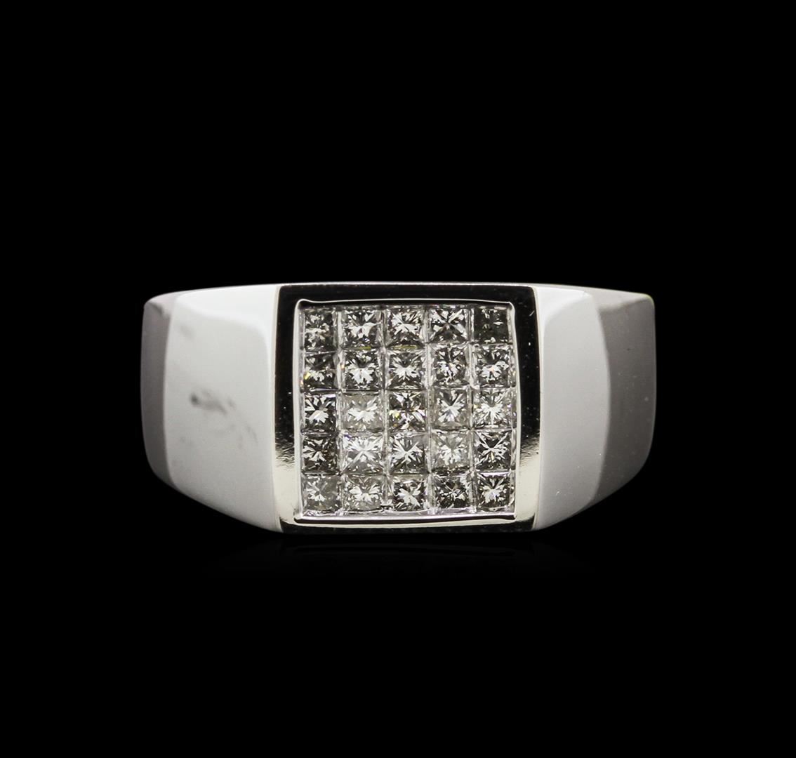 One electronically tested 14KT white gold man's cast fashion ring with a tapered shank with a bright polish finish. Condition is new. Identified with markings of "14K". Containing: Twenty-five invisible set princess cut diamonds, measuring 2.00 x 1.90 x 1.43mm (depth est.) approximate total weight of 25 Stones = 1.01ct. Graded in the setting. Clarity: VS-2 to SI-2. Color: H - M. Cut: Good. Total Weight of Diamonds: 1.01ct. Total Weight of Ring: 9.80 gm. GAS Appraised at $5,515.00.
