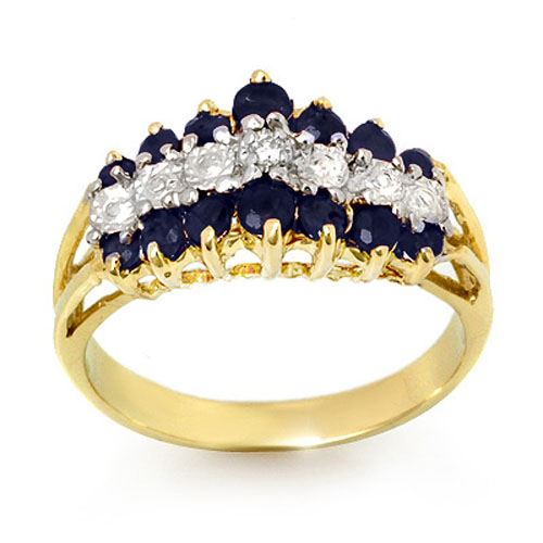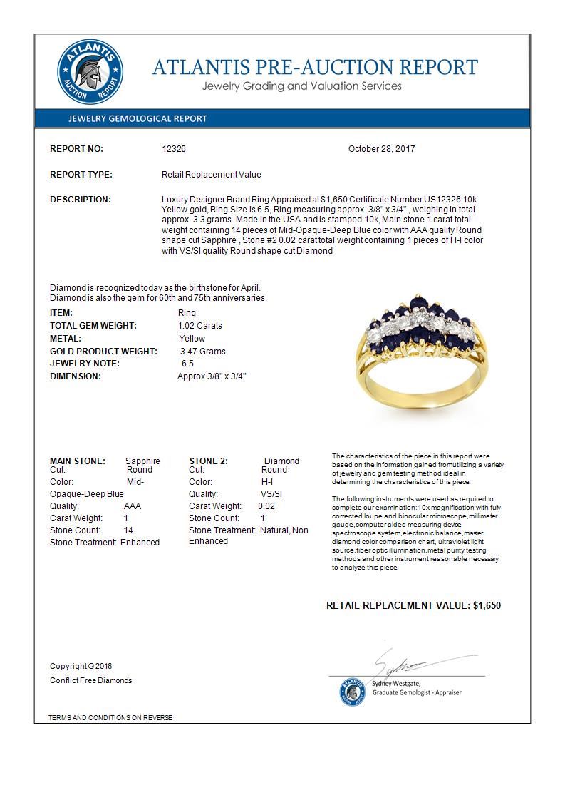 REF-27Y3K -12326 ---- 1.02 CTW Blue Sapphire & Diamond Ring 10K Yellow Gold ---- Luxury Designer Brand Ring Appraised at $1,650 Certificate Number US12326 10k Yellow gold, Ring Size is 6.5, Ring measuring approx. 3/8" x 3/4" , weighing in total approx. 3.3 grams. Made in the USA and is stamped 10k, Main stone 1 carat total weight containing 14 pieces of Mid-Opaque-Deep Blue color with AAA quality Round shape cut Sapphire , Stone #2 0.02 carat total weight containing 1 pieces of H-I color with VS/SI quality Round shape cut Diamond