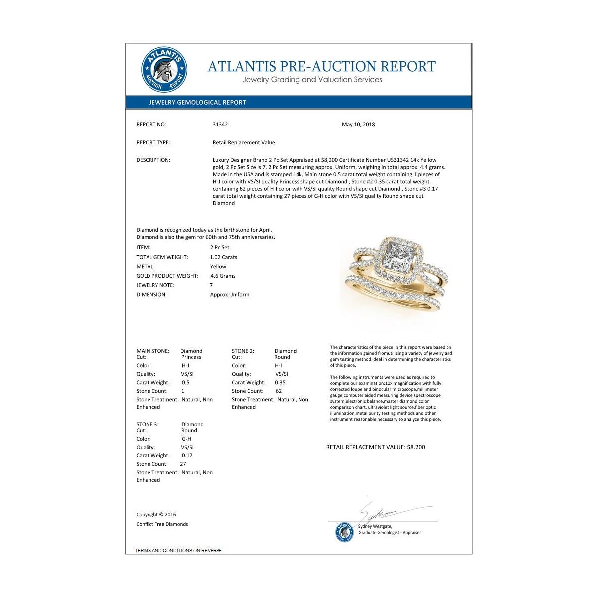 REF-149N5Y -31342 ---- 1.02 CTW Certified VS/SI Princess Diamond 2Pc Set Solitaire Halo 14K Yellow Gold ---- Luxury Designer Brand 2 Pc Set Appraised at $8,200 Certificate Number US31342 14k Yellow gold, 2 Pc Set Size is 7, 2 Pc Set measuring approx. Uniform, weighing in total approx. 4.4 grams. Made in the USA and is stamped 14k, Main stone 0.5 carat total weight containing 1 pieces of H-J color with VS/SI quality Princess shape cut Diamond , Stone #2 0.35 carat total weight containing 62 pieces of H-I color with VS/SI quality Round shape cut Diamond , Stone #3 0.17 carat total weight containing 27 pieces of G-H color with VS/SI quality Round shape cut Diamond
