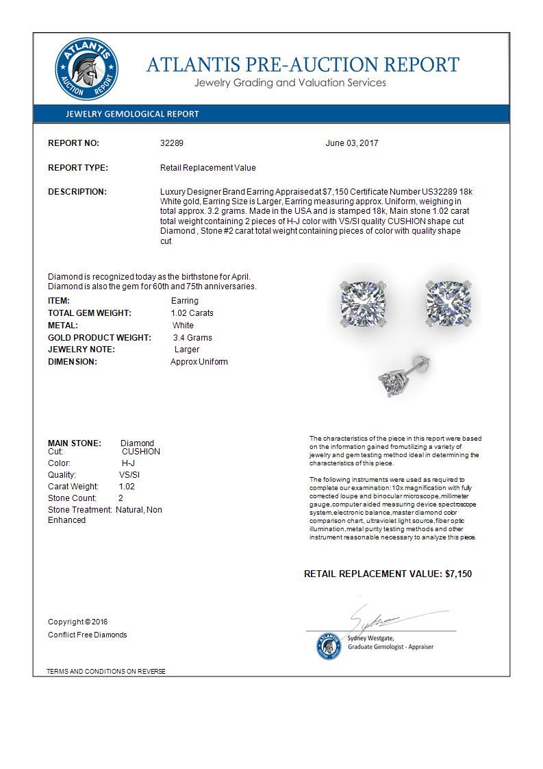 1.02 CTW Cushion Cut VS/SI Diamond Stud Designer Earrings 18K White Gold ---- Luxury Designer Brand Earring Appraised Retail Price at $7,150 ---- SKU Number US32289 18k White gold Earring Size is Larger, Earring measuring approx. Uniform, weighing in total approx. 3.2 grams. Made in the USA and is stamped 18k, Main stone 1.02 carat total weight containing 2 pieces of H-J color with VS/SI quality CUSHION shape cut Diamond , Stone #2 carat total weight containing pieces of color with quality shape cut