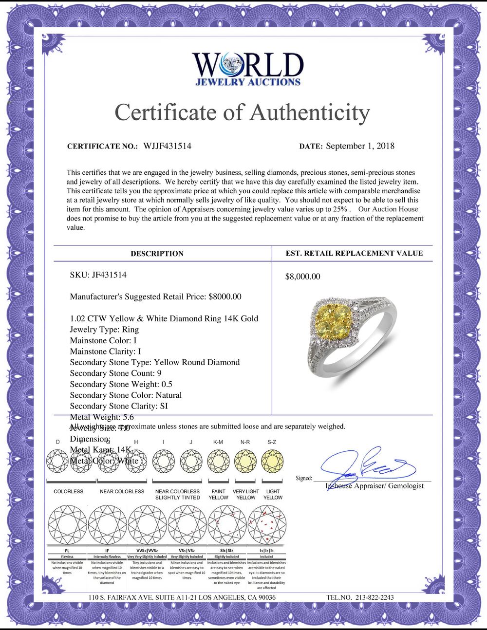 All property is sold “AS IS”, and ALL SALES ARE FINAL. Property is open to thorough public inspection. It is the Bidder’s responsibility to determine condition, age, genuineness, value or any other determinative factor. WJA may attempt to describe the merchandise in advertising and on the Internet but makes no representations. In no event shall WORLD JEWELRY AUCTION be held responsible for having made or implied any warranty of merchantability or fitness for a particular purpose. Bidder shall be the sole judge of value.