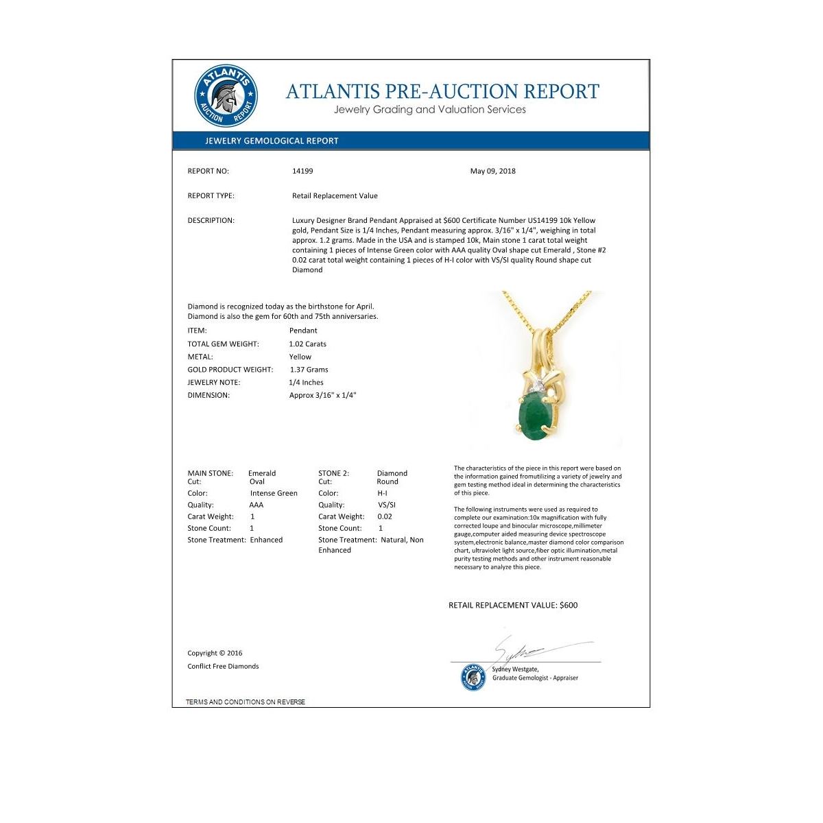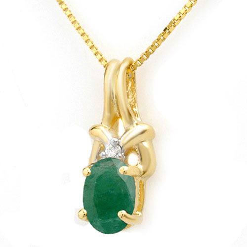 REF-9T3M -14199 ---- 1.02 CTW Emerald & Diamond Pendant 10K Yellow Gold ---- Luxury Designer Brand Pendant Appraised at $600 Certificate Number US14199 10k Yellow gold, Pendant Size is 1/4 Inches, Pendant measuring approx. 3/16" x 1/4", weighing in total approx. 1.2 grams. Made in the USA and is stamped 10k, Main stone 1 carat total weight containing 1 pieces of Intense Green color with AAA quality Oval shape cut Emerald , Stone #2 0.02 carat total weight containing 1 pieces of H-I color with VS/SI quality Round shape cut Diamond
