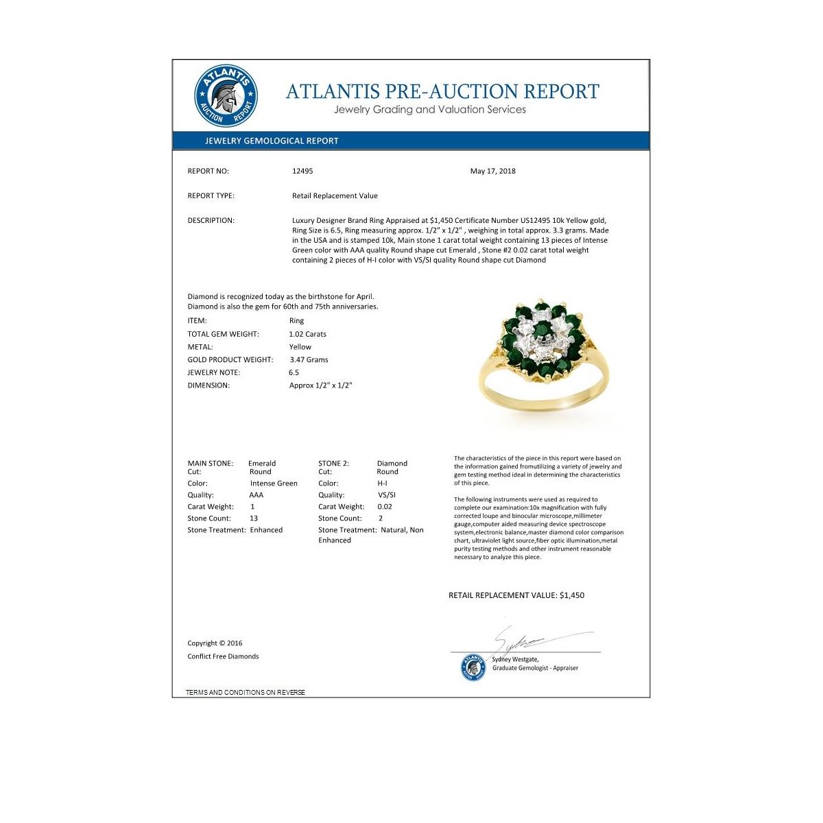 REF-21K6W -12495 ---- 1.02 CTW Emerald & Diamond Ring 10K Yellow Gold ---- Luxury Designer Brand Ring Appraised at $1,450 Certificate Number US12495 10k Yellow gold, Ring Size is 6.5, Ring measuring approx. 1/2" x 1/2" , weighing in total approx. 3.3 grams. Made in the USA and is stamped 10k, Main stone 1 carat total weight containing 13 pieces of Intense Green color with AAA quality Round shape cut Emerald , Stone #2 0.02 carat total weight containing 2 pieces of H-I color with VS/SI quality Round shape cut Diamond