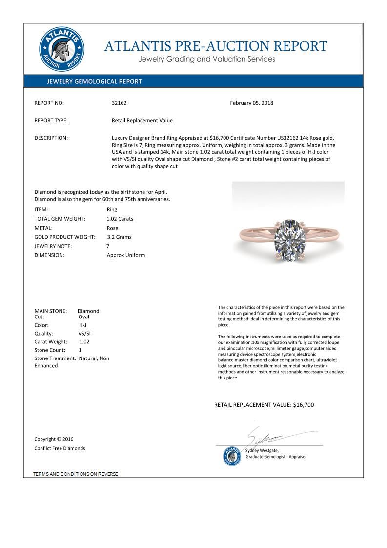 REF-278A3X -32162 ---- 1.02 CTW Oval Cut VS/SI Diamond Engagement Designer Ring 14K Rose Gold ---- Luxury Designer Brand Ring Appraised at $16,700 Certificate Number US32162 14k Rose gold, Ring Size is 7, Ring measuring approx. Uniform, weighing in total approx. 3 grams. Made in the USA and is stamped 14k, Main stone 1.02 carat total weight containing 1 pieces of H-J color with VS/SI quality Oval shape cut Diamond , Stone #2 carat total weight containing pieces of color with quality shape cut