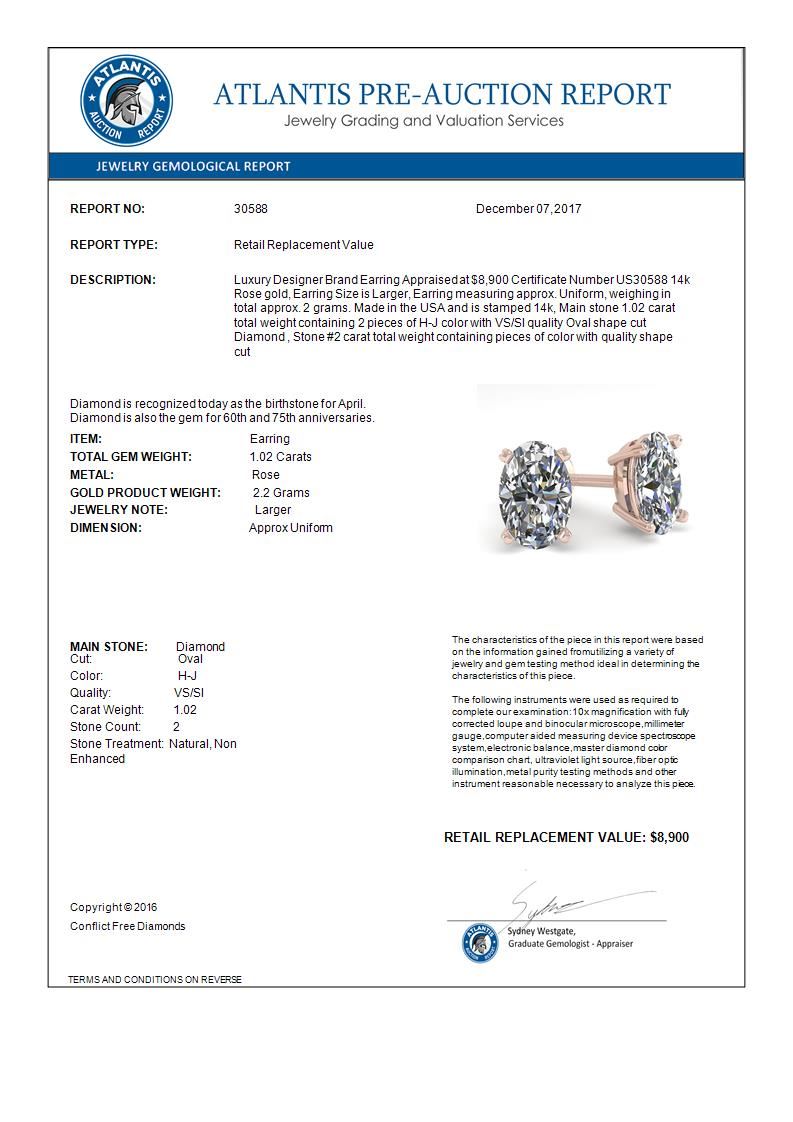 REF-148A5X -30588 ---- 1.02 CTW Oval Cut VS/SI Diamond Stud Designer Earrings 14K Rose Gold ---- Luxury Designer Brand Earring Appraised at $8,900 Certificate Number US30588 14k Rose gold, Earring Size is Larger, Earring measuring approx. Uniform, weighing in total approx. 2 grams. Made in the USA and is stamped 14k, Main stone 1.02 carat total weight containing 2 pieces of H-J color with VS/SI quality Oval shape cut Diamond , Stone #2 carat total weight containing pieces of color with quality shape cut