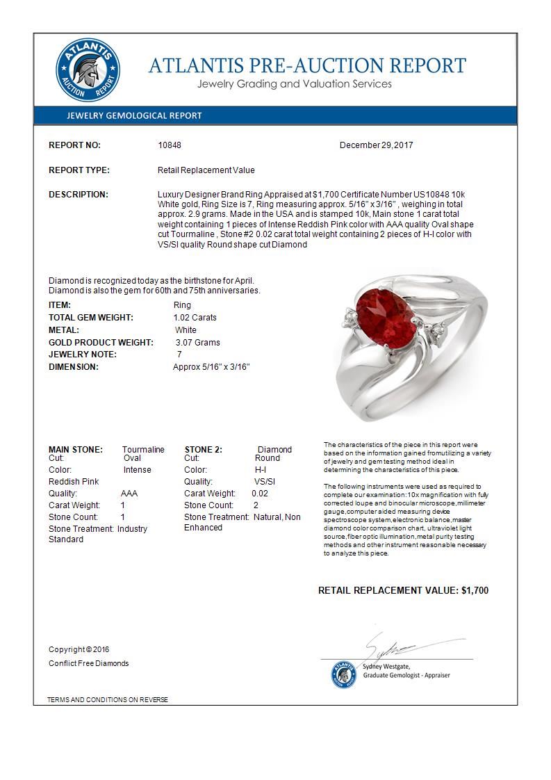 REF-22X2T -10848 ---- 1.02 CTW Pink Tourmaline & Diamond Ring 10K White Gold ---- Luxury Designer Brand Ring Appraised at $1,700 Certificate Number US10848 10k White gold, Ring Size is 7, Ring measuring approx. 5/16" x 3/16" , weighing in total approx. 2.9 grams. Made in the USA and is stamped 10k, Main stone 1 carat total weight containing 1 pieces of Intense Reddish Pink color with AAA quality Oval shape cut Tourmaline , Stone #2 0.02 carat total weight containing 2 pieces of H-I color with VS/SI quality Round shape cut Diamond