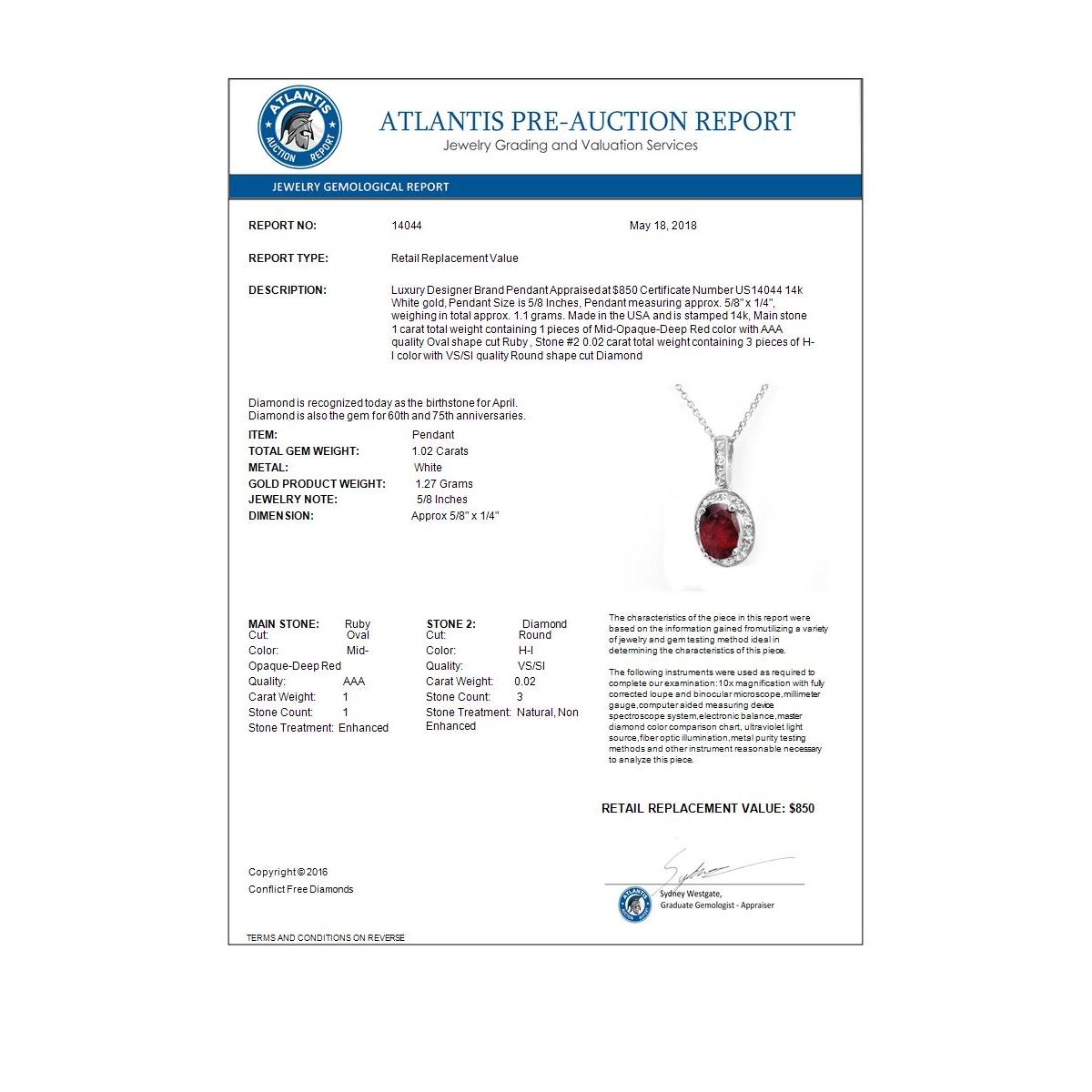 REF-12H8A -14044 ---- 1.02 CTW Ruby & Diamond Pendant 14K White Gold ---- Luxury Designer Brand Pendant Appraised at $850 Certificate Number US14044 14k White gold, Pendant Size is 5/8 Inches, Pendant measuring approx. 5/8" x 1/4", weighing in total approx. 1.1 grams. Made in the USA and is stamped 14k, Main stone 1 carat total weight containing 1 pieces of Mid-Opaque-Deep Red color with AAA quality Oval shape cut Ruby , Stone #2 0.02 carat total weight containing 3 pieces of H-I color with VS/SI quality Round shape cut Diamond