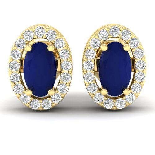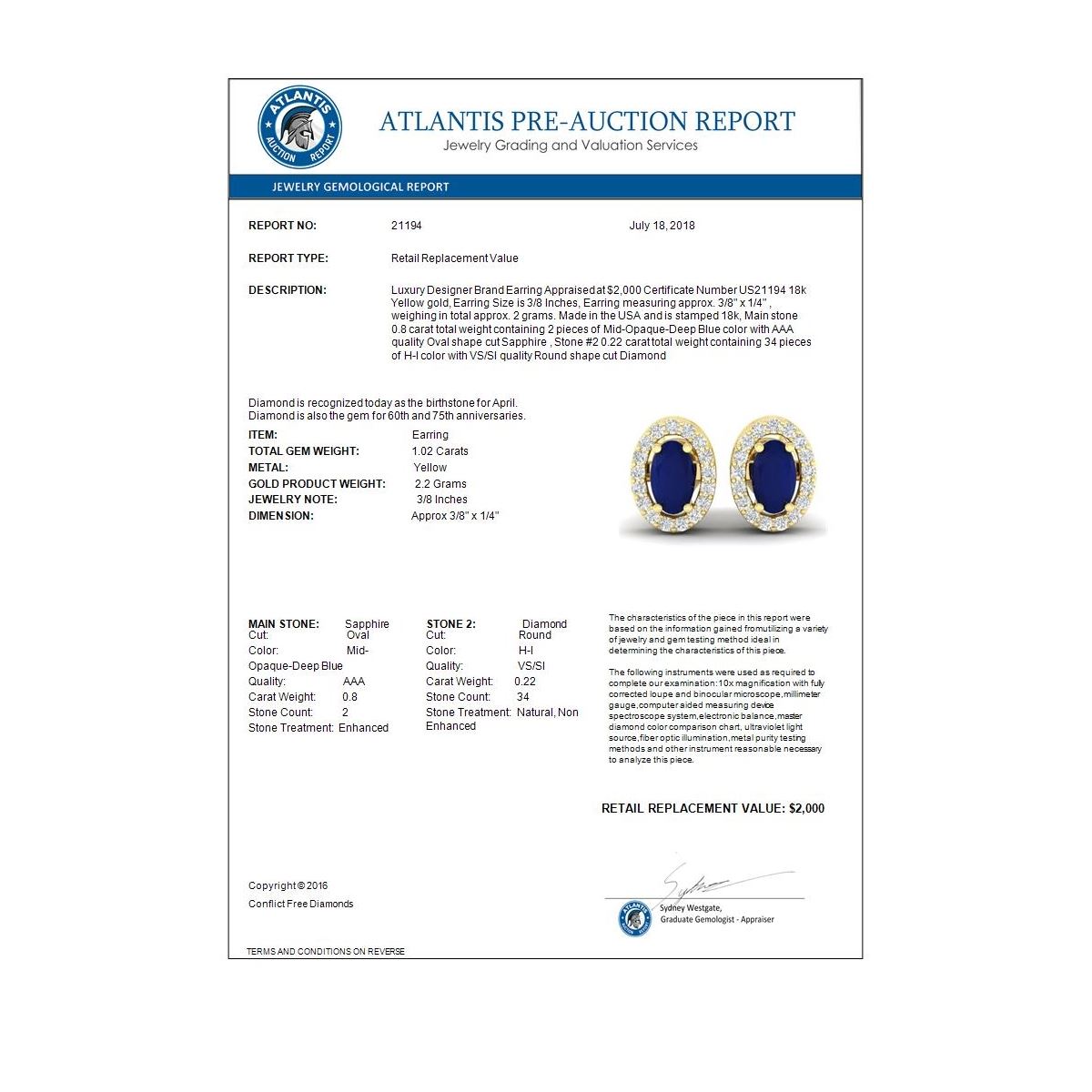 REF-32A8X -21194 ---- 1.02 CTW Sapphire & Micro Pave VS/SI Diamond Earrings Halo 18K Yellow Gold ---- Luxury Designer Brand Earring Appraised at $2,000 Certificate Number US21194 18k Yellow gold, Earring Size is 3/8 Inches, Earring measuring approx. 3/8" x 1/4" , weighing in total approx. 2 grams. Made in the USA and is stamped 18k, Main stone 0.8 carat total weight containing 2 pieces of Mid-Opaque-Deep Blue color with AAA quality Oval shape cut Sapphire , Stone #2 0.22 carat total weight containing 34 pieces of H-I color with VS/SI quality Round shape cut Diamond